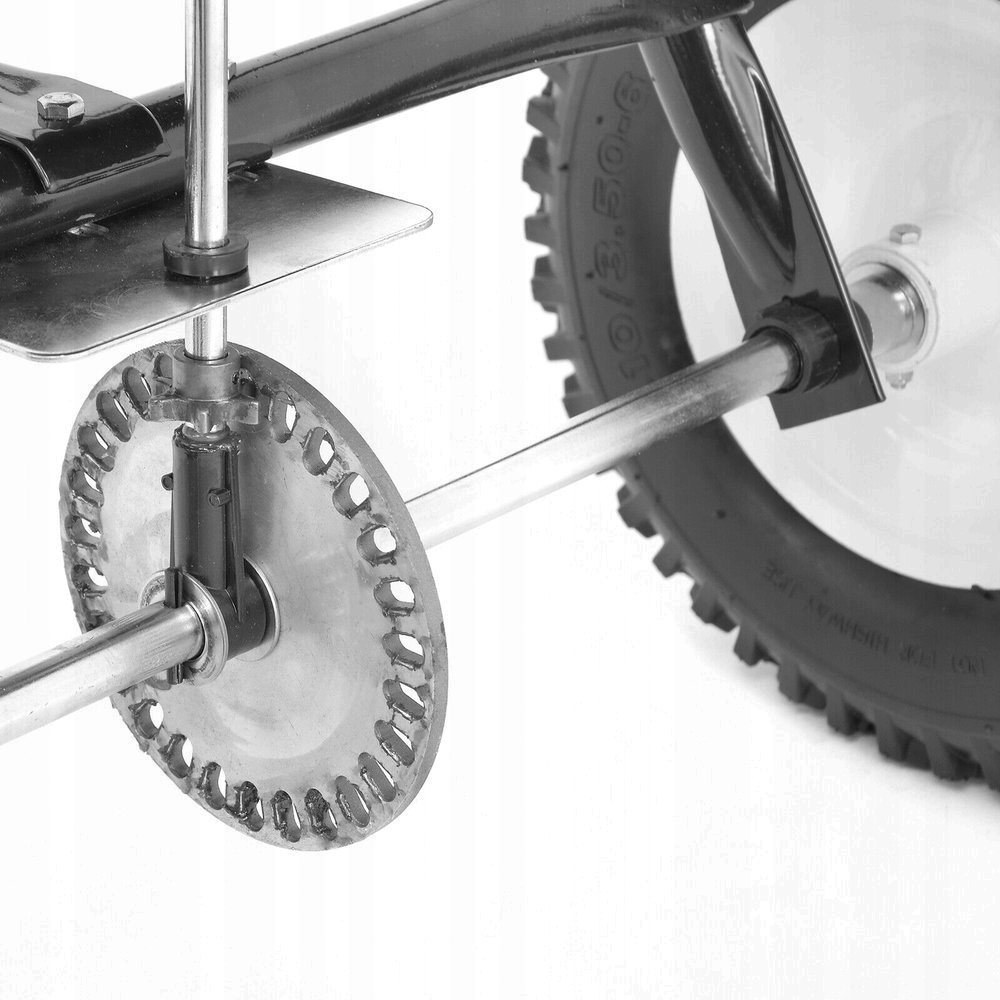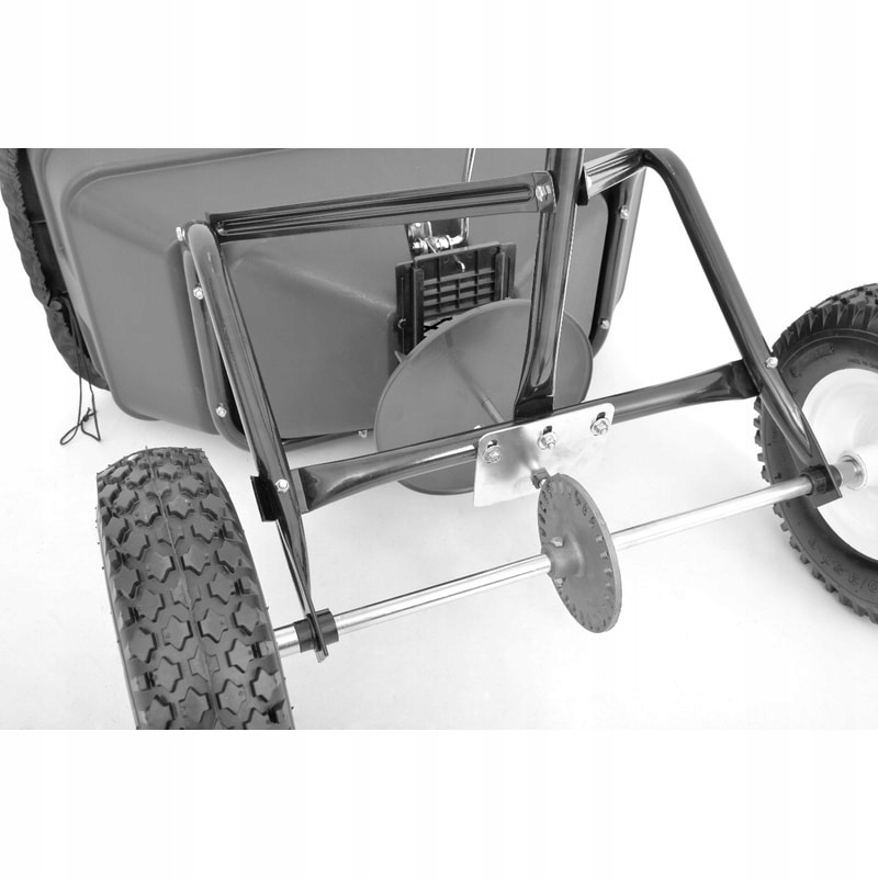 Розкидач використовує металевий механізм, який дозволяє розкидати ширину до 3,5 метрів. Розкид регулюється спеціальним важелем, встановленим на головній рукоятці, і залежить від швидкості руху. Використання надувних опорних катків і невелика вага пристрою 17,3 кг гарантують високу маневреність і легкість роботи з цим незамінним садовим помічником.