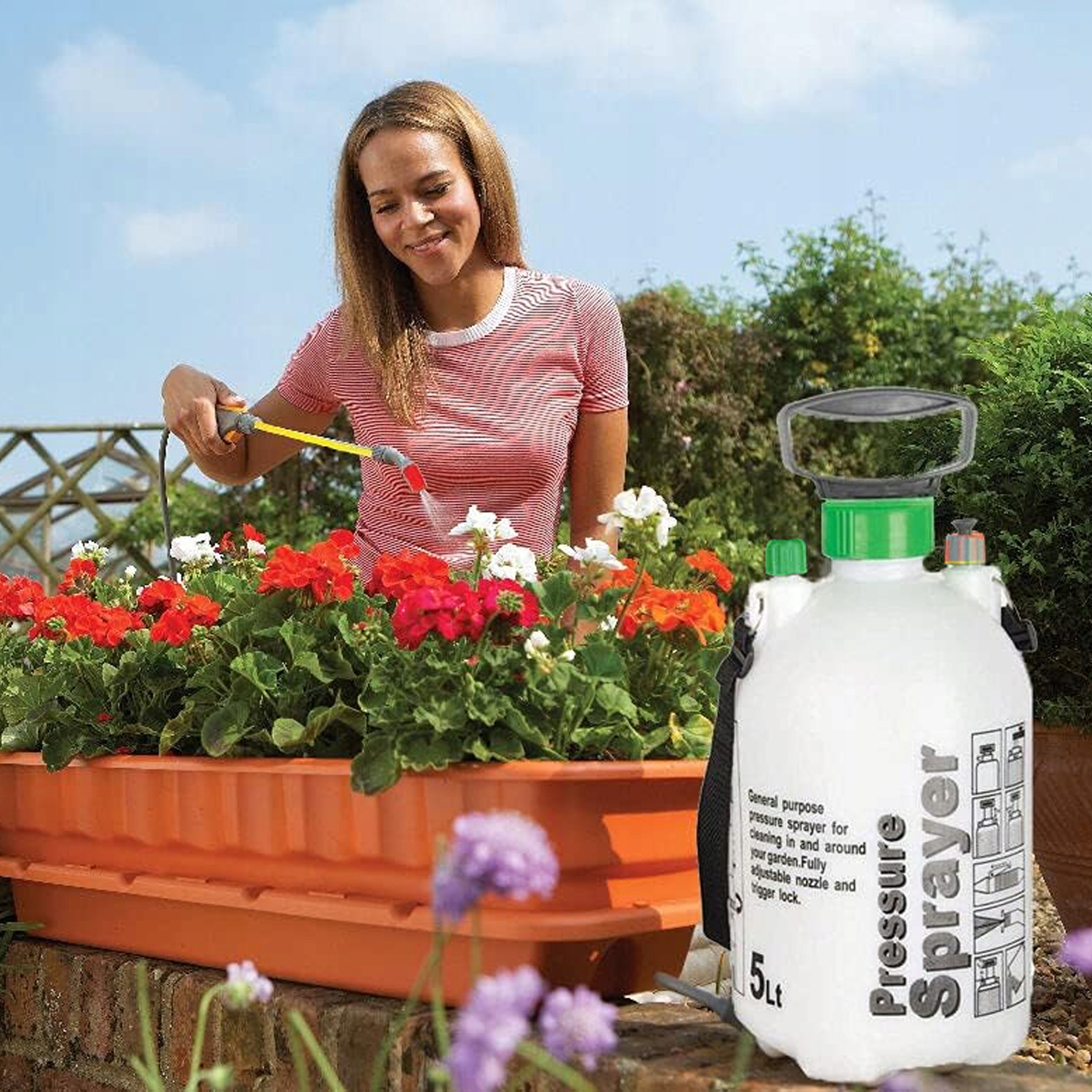 Цей обприскувач під тиском допоможе вам виконувати всі види робіт у саду та домашньому господарстві. Обприскувач під тиском5 літрів можнавикористовувати для поливу рослин або розпилення пестицидів і хімікатів чистячі засоби. Якщо обприскувач виявиться надто важким протягом тривалого часу,ви можете просто повісити його на плечі за допомогою регульованого ременя для транспортування. Крім того, важіль тиску можна заблокувати для безперервного розпилення, а потік можна регулювати за допомогою форсунки.