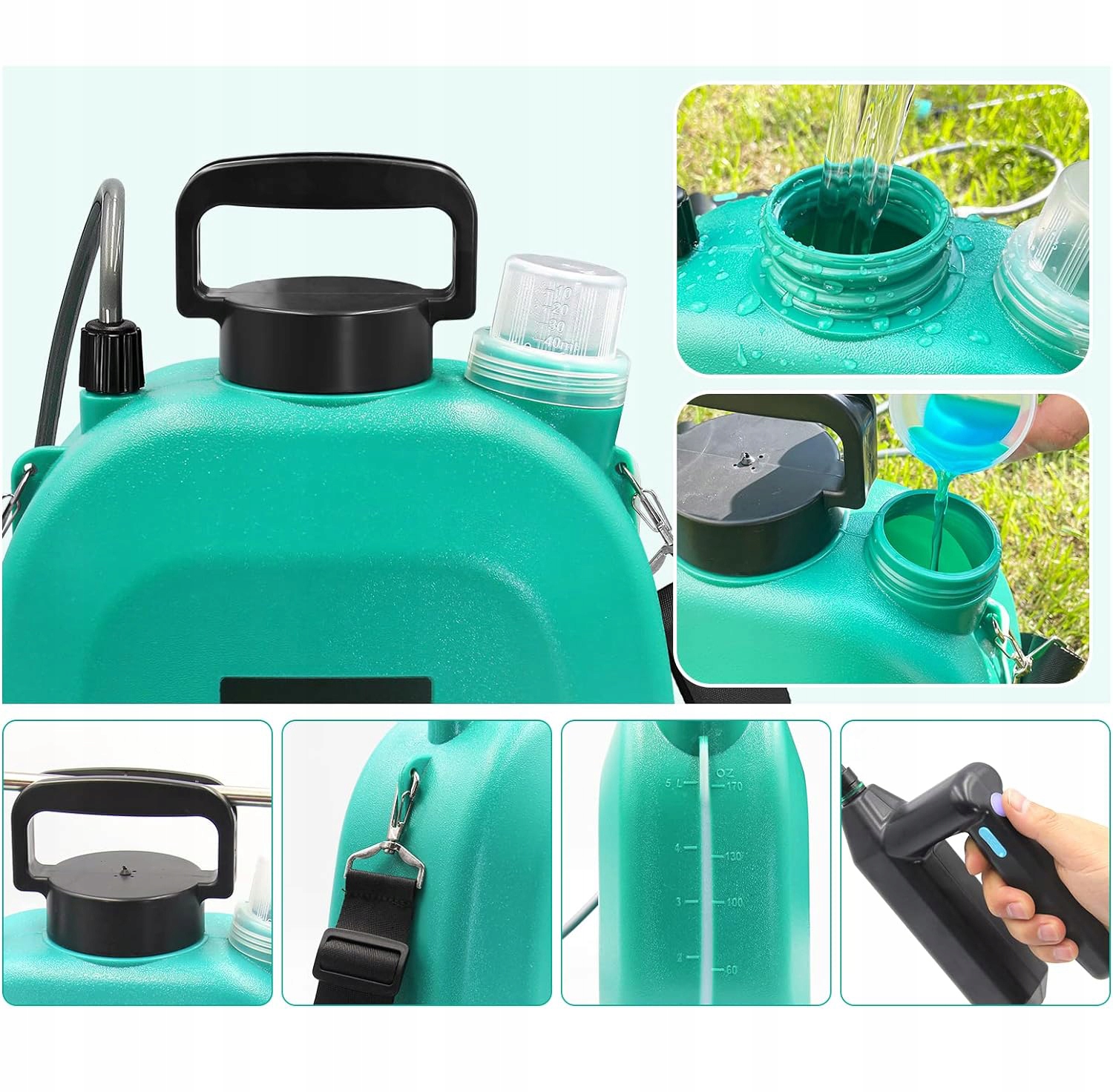 - З ємністю 5 літрів цей обприскувач ідеально підходить для різноманітних завдань, зокрема для поливу рослин, прополки та внесення добрив газони, розпилення добрив або гербіцидів, прибирання будинку чи автомобіля та полив саду. Незалежно від того, чи є ви досвідченим садівником, чи початківцем, цей акумуляторний обприскувач є необхідним інструментом для досягнення виняткових результатів