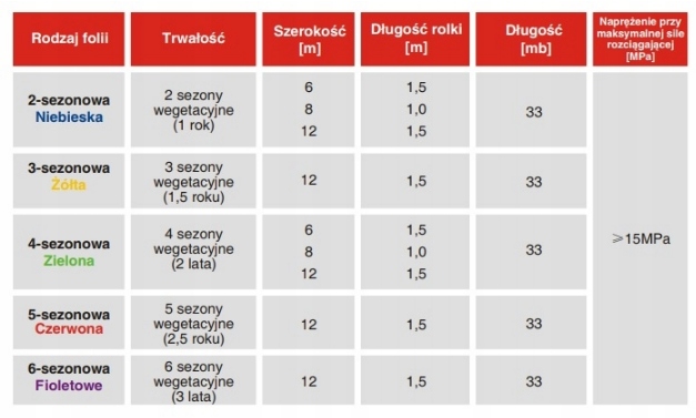 Садова плівка від Плоцька доступна в п’яти кольорах, що вказують на тривалість використання (сезонність).