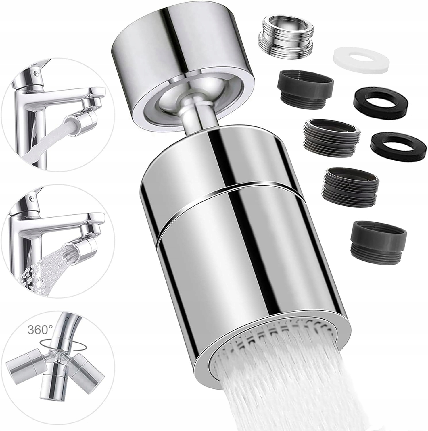 Максимальний кут вгору та вниз може досягати 80 градусів, а обертання на 360 градусів дозволяє воді текти в усі кути раковина, яку дуже зручно мити і не накопичує бруд; Повний діапазон рухів дозволяє легко промити/очистити раковину, щоб швидко очистити різні предмети в кутах раковини, щоб підвищити ефективність прибирання кухні.