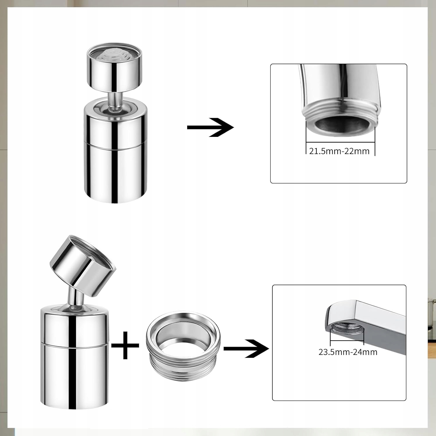 Кріплення на крані з внутрішньою різьбою 55/64 дюйма - 22 мм безпосередньо підходить для мітчика з зовнішньою різьбою 22 мм. і постачається з аксесуарами із зовнішньою різьбою 15/16 дюймів - 24 мм для підключення мітчика з внутрішньою різьбою 24 мм. Якщо діаметр мітчика становить 22 мм, підключайте безпосередньо; якщо діаметр внутрішньої різьби становить 24 мм, підключіть за допомогою адаптера, що входить до комплекту.