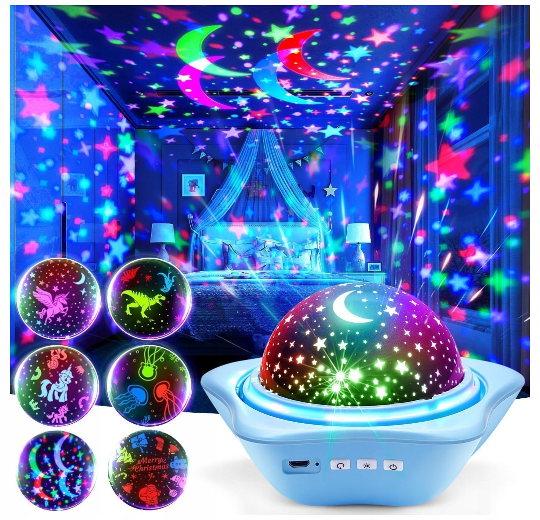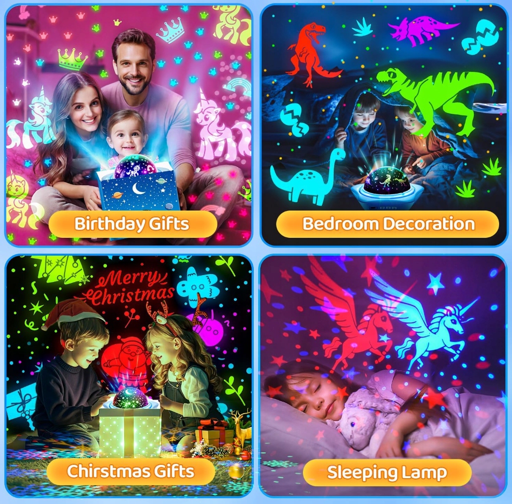 Дитячий стельовий зірковий проектор має 6 тем проекції каваї: зірки та місяць, морські світи та динозавр. Проектор зоряного неба доступний з 4 надяскравими світлодіодними лампами (червоний, синій, зелений, фіолетовий).