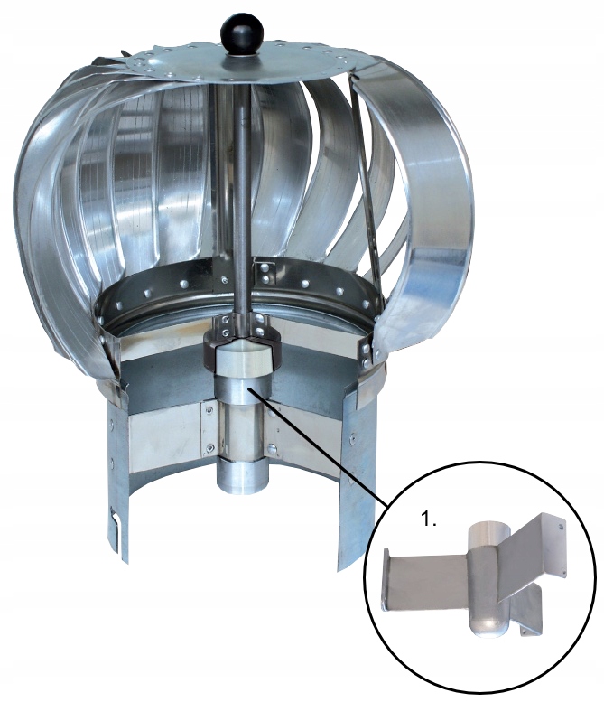 Кожух димоходу складається з основи з оцинкованого металевого листа товщиною 0,6 мм і турбіни з алюмінієвого листа товщиною 0,5 мм (обод турбіни з кислотостійка стальзабезпечує жорстку та довговічну конструкцію турбіни та водночас стійкість до зміни погодних умов). Основа розбірна, що забезпечує легкий доступ до внутрішньої частини турбіни та вентиляційного димоходу. Ротор встановлений на кулькових підшипниках, що працюють в маслі, в герметичному однорідному корпусі з литого алюмінію (1.). Довговічне, безвідмовне рішення і, перш за все, дуже тихо.
