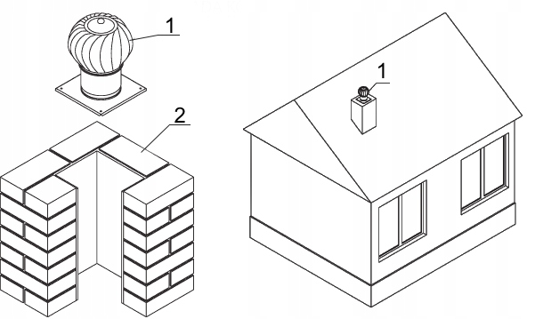 Можна встановити поворотну основу (1) на плоских горизонтальних поверхнях, напр. в кінці вентиляційного димоходу (2). Кріплення безпосередньо до землі можливе за допомогою чотирьох розширювальних дюбелів, які входять у комплект.