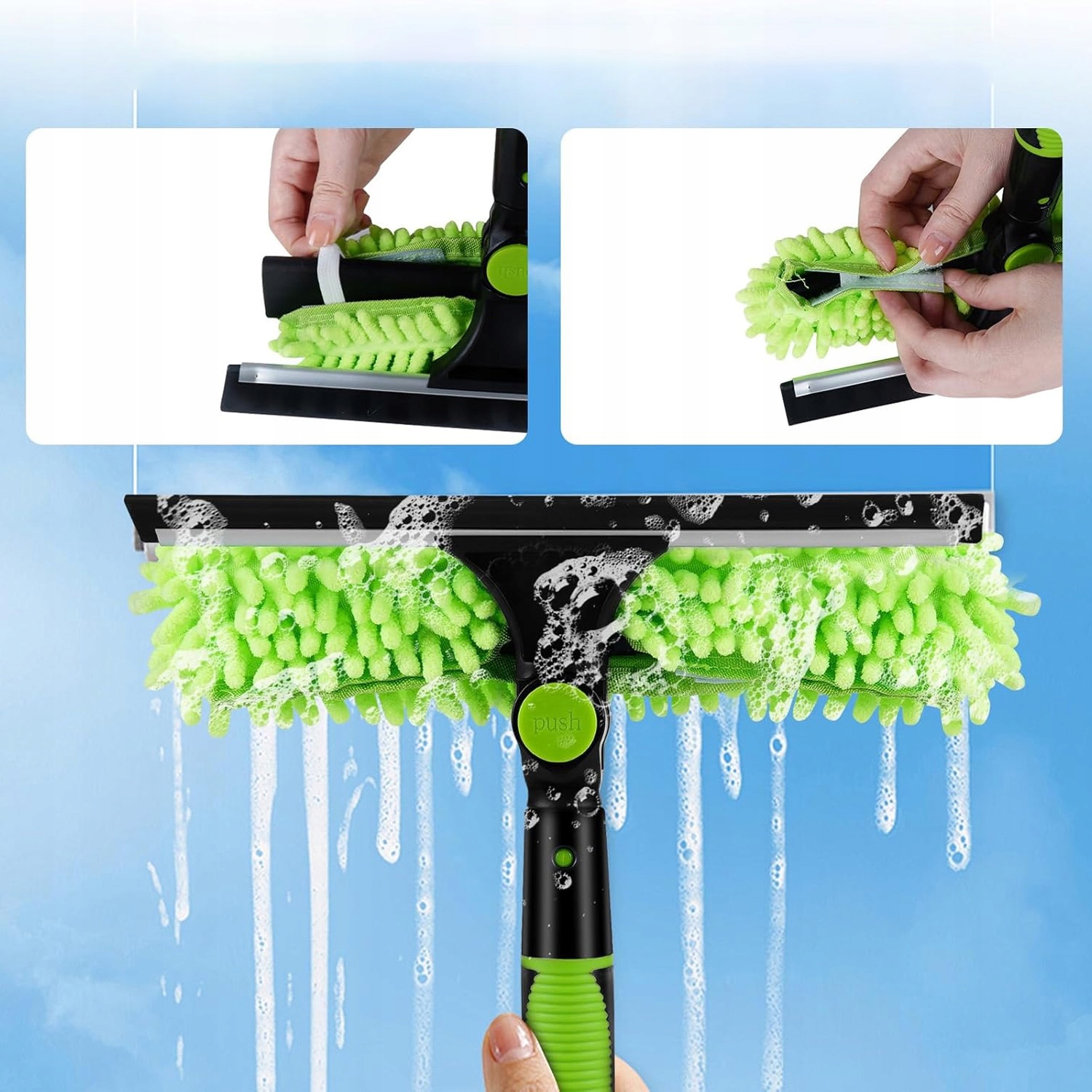 Гумовий скребок регулюється кнопкою для складних місць. Синель відмінно збирає воду, а мікрофібра справляється зі стійкими забрудненнями. Ви миєте вікна, дзеркала 🪞, вікна автомобілів 🚗, скляні панелі та навіть човни! ⛵