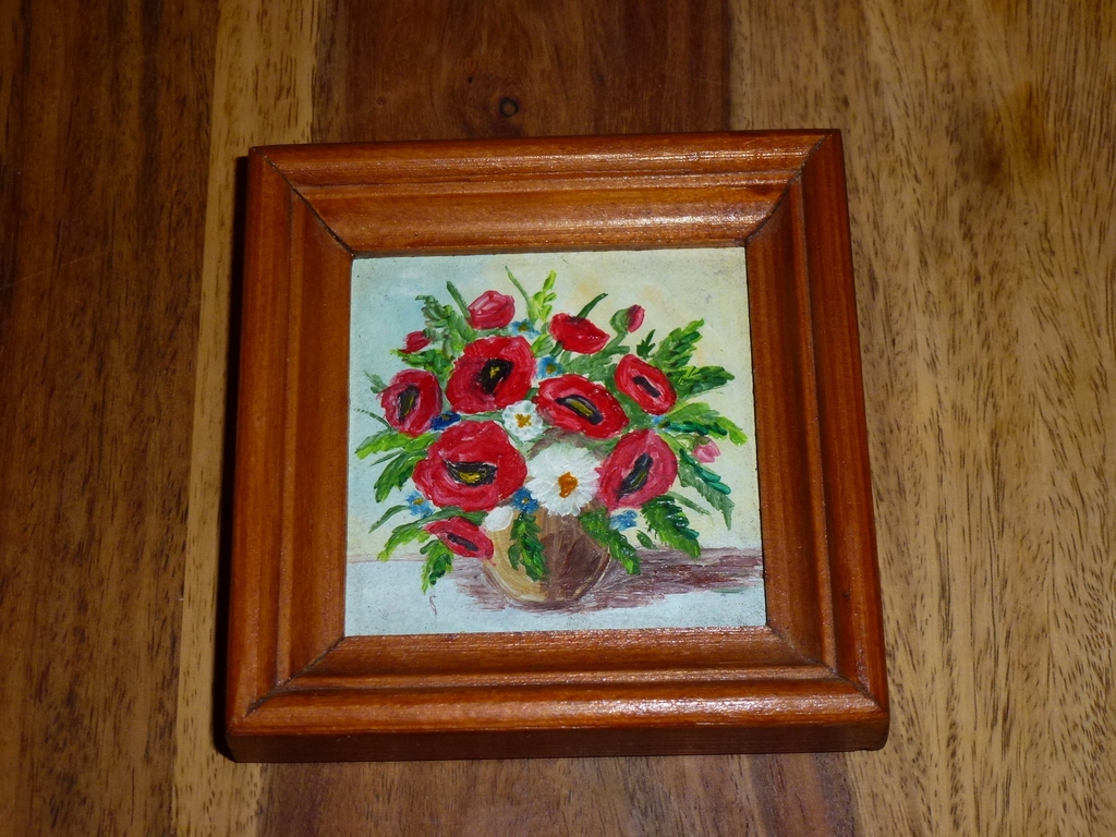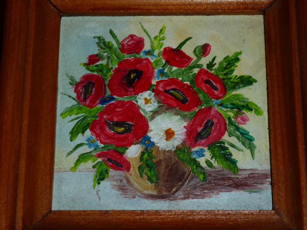 пропоную оригінальну картину маслом на фанері - мініатюру з букетом квітів (переважають маки).