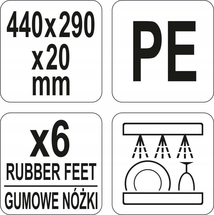Універсальна біла обробна дошка, призначена для використання в гастрономії. Виготовлений з високоякісного поліетилену товщиною 20 мм, що забезпечує високу міцність і довговічність. Дошка YATO має 6 гумових протиковзких ніжок, які запобігають ковзанню під час роботи. Заокруглені краї та ретельне виконання підвищують безпеку під час роботи.