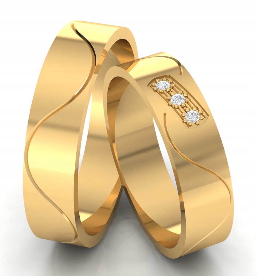 Елегантні, блискучі обручки з плоским профілем. Прикрашена витонченою хвилястою лінією, виконаною алмазною фрезою. Відмінною рисою жіночої обручки є три циркони, закріплені всередині косого зрізу. Камені можна обміняти на дорогоцінні діаманти. Цей прекрасний символ вашого шлюбу буде супроводжувати вас усе життя.