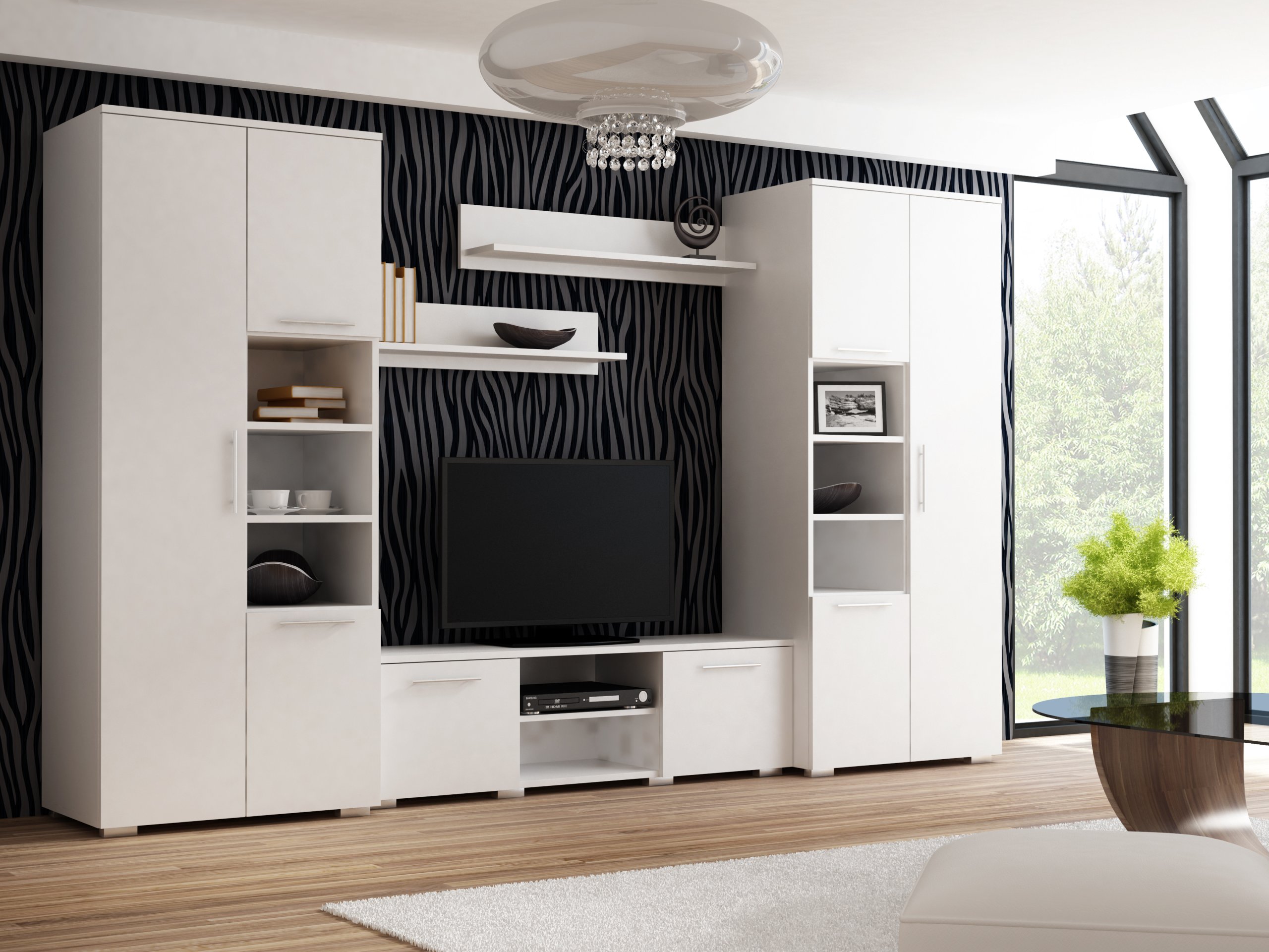 Прямі лінії та увага до деталей роблять стельку Apollo гарною для будь-якого інтер’єру. Від скандинавського клімату через мінімалізм до сучасних і дизайнерських домовленостей. Дві високі шафи забезпечують багато місця для зберігання. Комод допоможе виставити телевізійну техніку, приховавши кабелі. Підвісні полиці стануть в нагоді для дрібничок або сімейних фотографій. Такий комплект меблів буде добре виглядати як у вітальні, так і в кімнаті підлітка. Також може підійти для кімнати для гостей