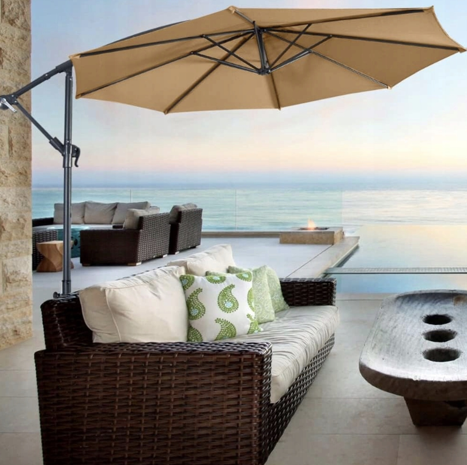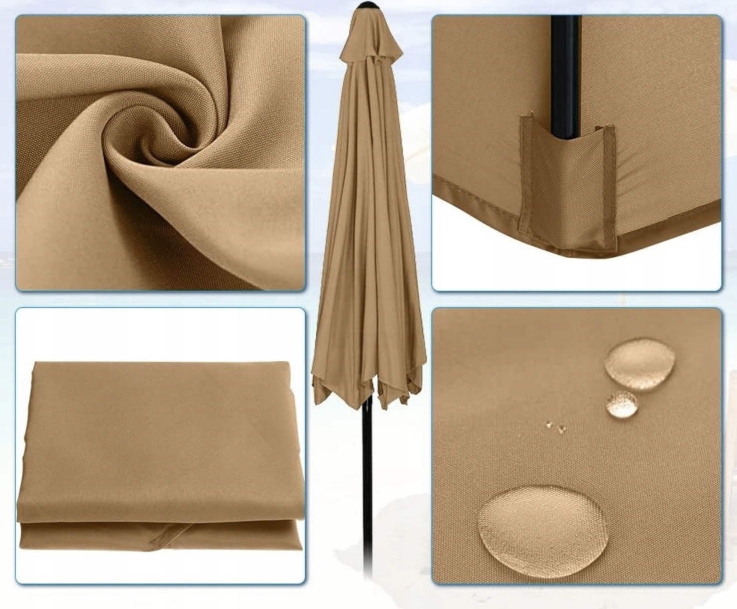 - Відмінна вентиляція: отвір у капоті обшивки забезпечує відмінну циркуляцію повітря, що запобігає перегріву під парасолькою. Завдяки цьому користувачі можуть насолоджуватися комфортною тінню навіть у найгарячіші дні. Це інноваційне рішення покращує комфорт використання парасольки. Універсальність покриття робить його універсальним рішенням, яке можна використовувати в різних моделях парасольок, що дозволяє легко замінити без необхідності купувати нову парасольку. 4 Інтенсивна кольорова палітра змушує парасольку стати привабливим декоративним елементом, який освіжає зовнішній вигляд всього саду чи тераси. Це просте рішення, яке додає естетику до зовнішніх просторів.