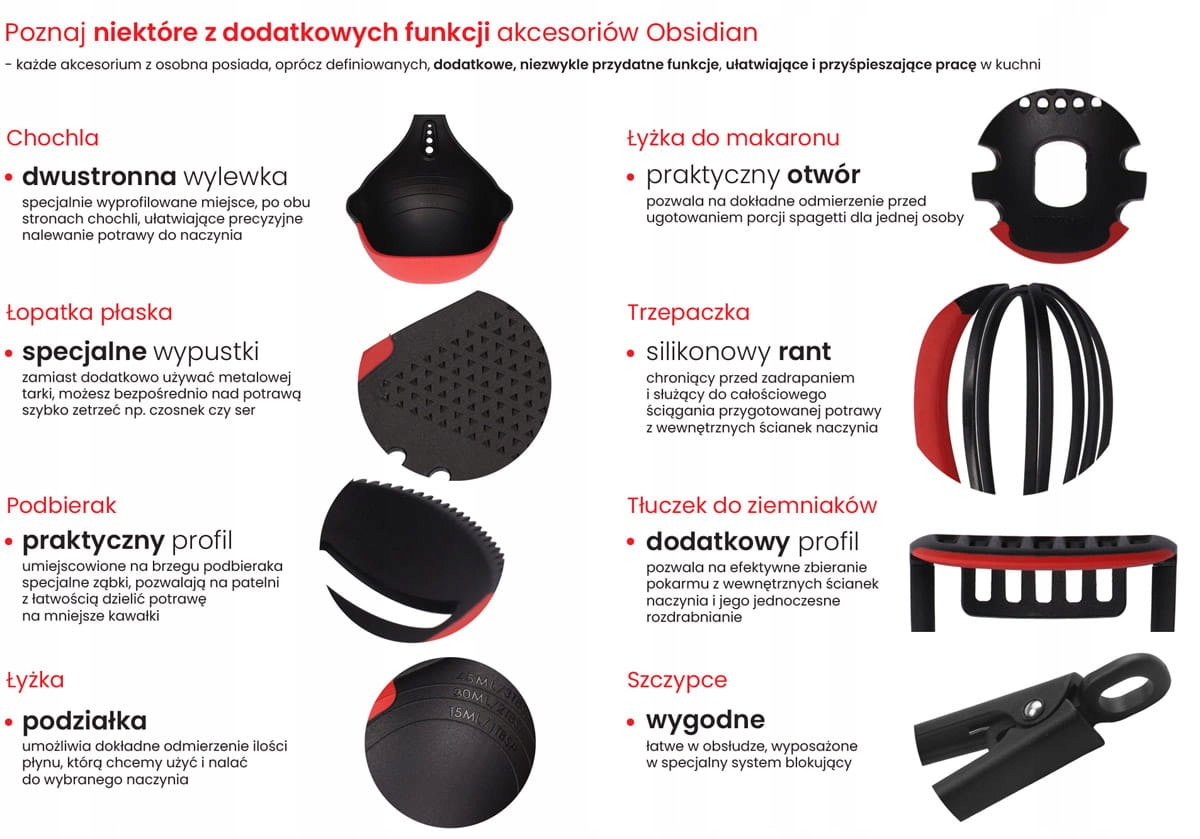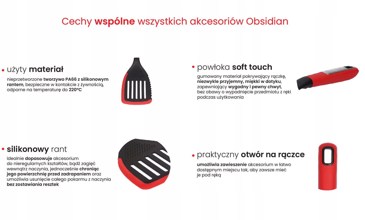 Надзвичайна функціональність і сучасна форма – це особливості кухонних аксесуарів лінії Obsidian. Вони виготовлені з необробленого матеріалу з додаванням силікону і розроблені для високого комфорту використання. Крім того, ідеально профільована ергономічна рукоятка, вкрита покриттям soft touch, забезпечує зручне та надійне захоплення. Крім того, аксесуари можна мити в механічній посудомийній машині або так само ефективно вручну під проточною водою. Завдяки своїм кольорам, матеріалам і дизайну ці аксесуари ідеально доповнюють сковорідки і каструлі з лінії Obsidian. Аксесуари