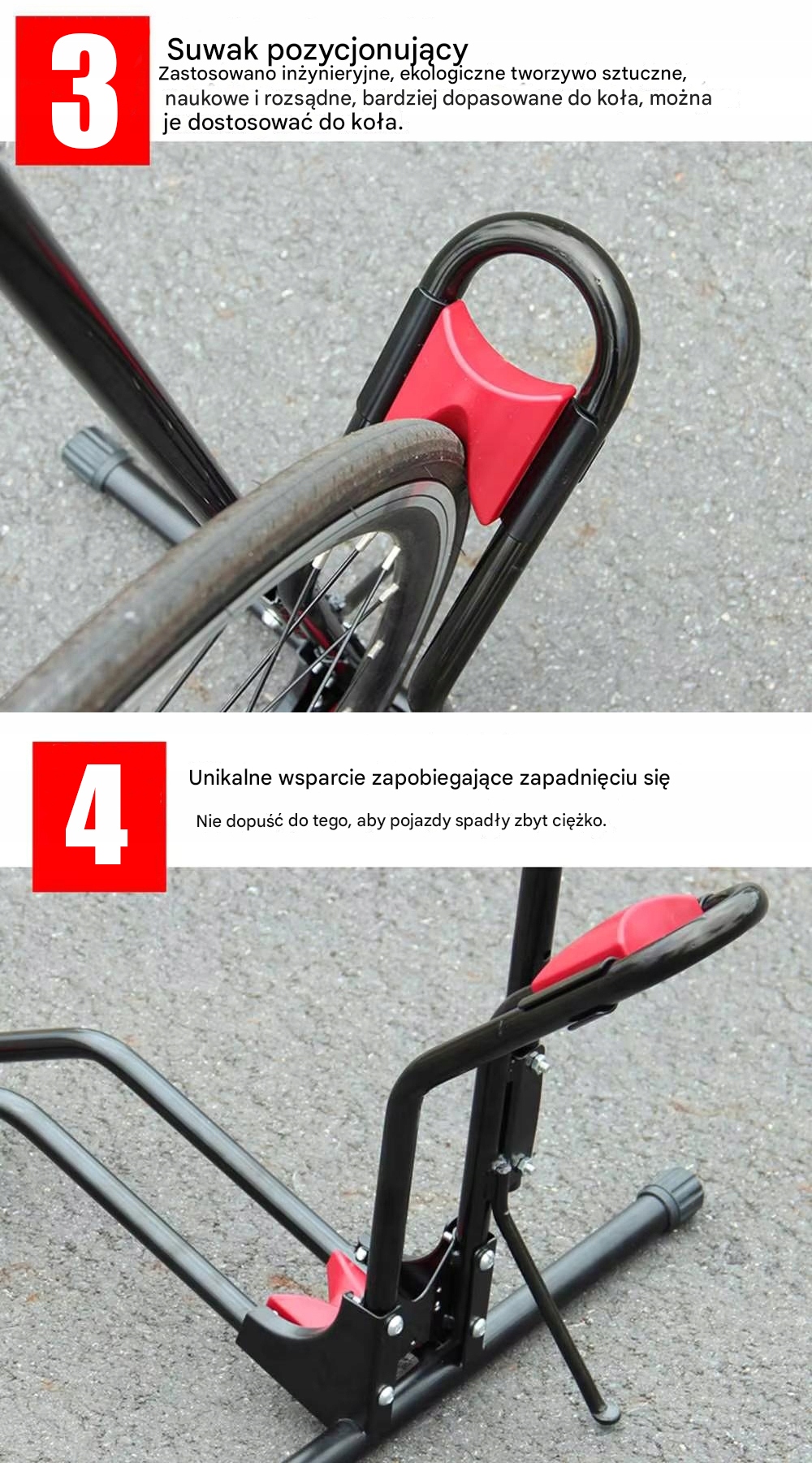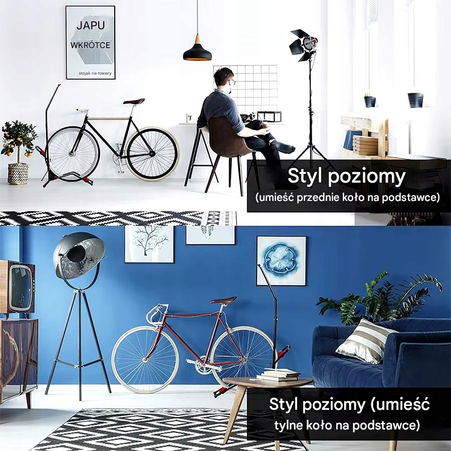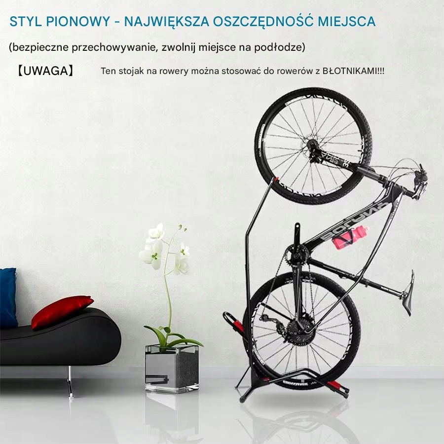 Велосипед кріпиться на підставку, вставляючи колесо в нижній тримач. Якщо ми плануємо тримати велосипед горизонтально, вставте переднє або заднє колесо (рекомендовано) і воля! Велосипед стабілізований. Якщо ми хочемо заощадити простір і встановити велосипед у вертикальному положенні, ми кладемо заднє колесо в нижню стійку, а переднє підняте колесо чіпляємо за верхній гачок. Для безпеки давайте перевіримо, чи все гаразд.