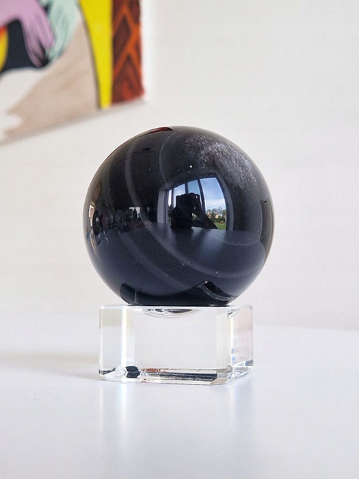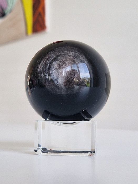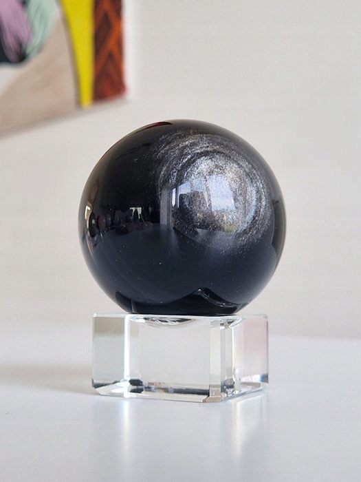 ПОЛІРОВАНА КУЛЯ З СРІБНОГО ОБСИДІАНУ, НАТУРАЛЬНИЙ КАМІНЬ З ПІДСТАВКОЮ