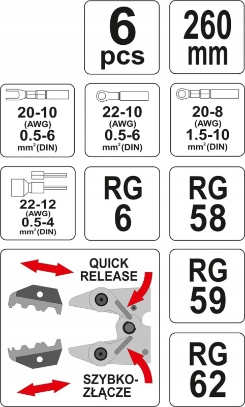 - п'ять змінних матриць для обтиску найпопулярніших типів з'єднувачів, зокрема: неізольовані, ізольовані, затискачі, гільзи, антенні роз’єми