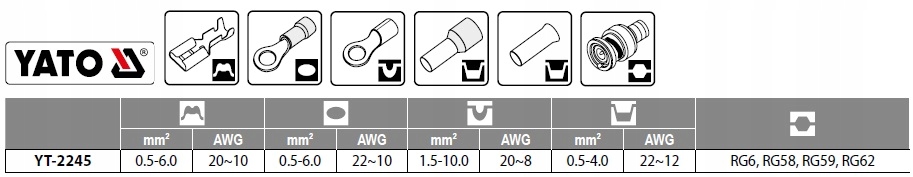 Щипці YT-2245 для обтиску найпопулярніших типів конекторів, з почорнілою поверхнею, що захищає від корозії, і двокомпонентними пластиковими накладками на ручки. Точна конструкція затискачів полегшує початкове розміщення з’єднувача, а довші ніж стандартні ручки та храповий механізм дозволяють точно й надійно затиснути без застосування великої сили.