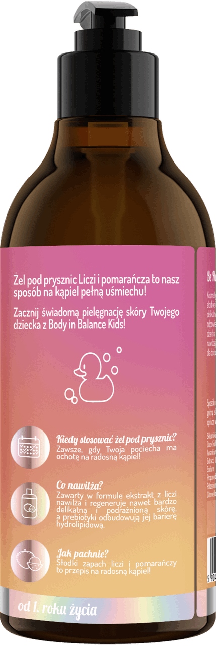 Ваня - це не лише час безтурботних розваг, а й можливість усвідомлено доглядати за ніжною шкірою вашої дитини. Тому гель для душу Body in Balance Kids містить аж 98% натуральних інгредієнтів, які піклуються про гідроліпідний бар’єр, який є захисним шаром шкіри. Продукт діє виключно м'яко і не викликає роздратування. Має зволожуючі та регенеруючі властивості, водночас огортає малюка солодким ароматом лічі та апельсина.