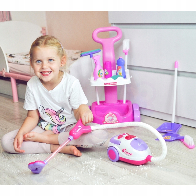набір очищення від авторитетної марки woopie - ідеальна ідея подарунка для маленької дівчинки. Це високо професіонал набір - це відтворення реального обладнання дорослих дорослих до очищення . Рожево-біла коляска оснащена додатковими аксесуарами , щоб дитина могла допомогти батькам прибирати. Вакуумний очищувач оснащений комутатором/комутатором та сигналізацією лампи. Гра в чистку з раннього віку може бути чудовим способом навчитися піклуватися про чистоту . Малюки люблять імітувати дорослих. З таким набором це буде набагато простіше!