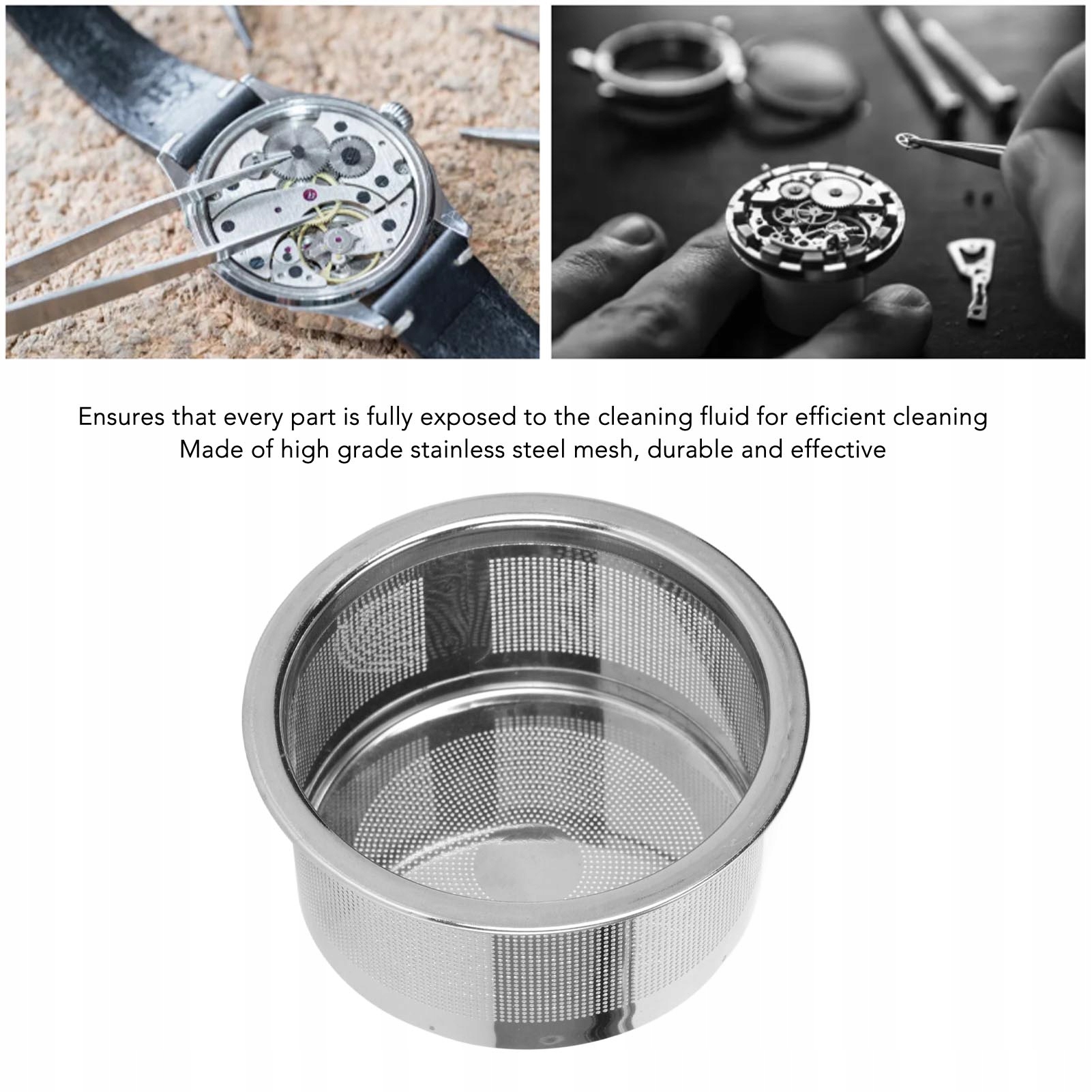 Функція: 1. Багатофункціональний: Цей кошик для чищення годинника дозволяє очистити невеликі частини годинників, невеликі камені, прикраси, прикраси, гвинти та інші мікро -партії без їх втрат або.