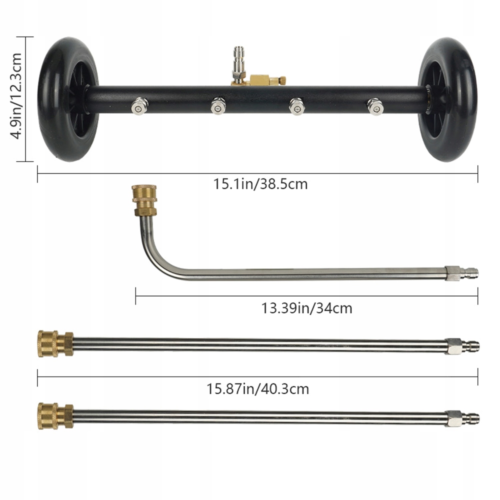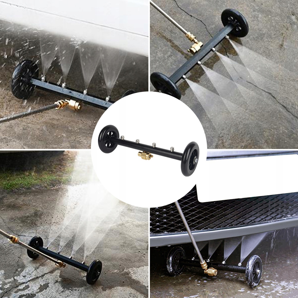 Досить встановити ролик перетворювача на шайбу з високим тиском і може бути використаний. 15-дюймова шайба шасі, підходить для гарячої та холодної води. Дизайн міцна, з 2 гнучкими гумовими колесами, що дозволяють легко рухатися, а також оснащені 4 форсунками, що збільшують очисну поверхню. Включає 3 розширення тиску, 1 зігнуті під кутом 90 градусів стрижня, 2 прямі стрижні 15,87 дюйма, 1500-4000 собак: обидва стрижні оснащені швидкими з'єднаннями з ниткою 1/4 дюйма для легкого з'єднання та відключення. Максимальний робочий тиск - 4000 фунтів на кв. Дюйм.