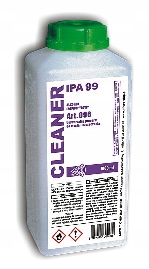 CLEANER IPA 99 містить ізопропіловий спирт чистотою 99%. Це універсальний миючий засіб. Хімічно нейтральний до більшості матеріалів, не залишає слідів, швидко випаровується. Чистота: 99%
