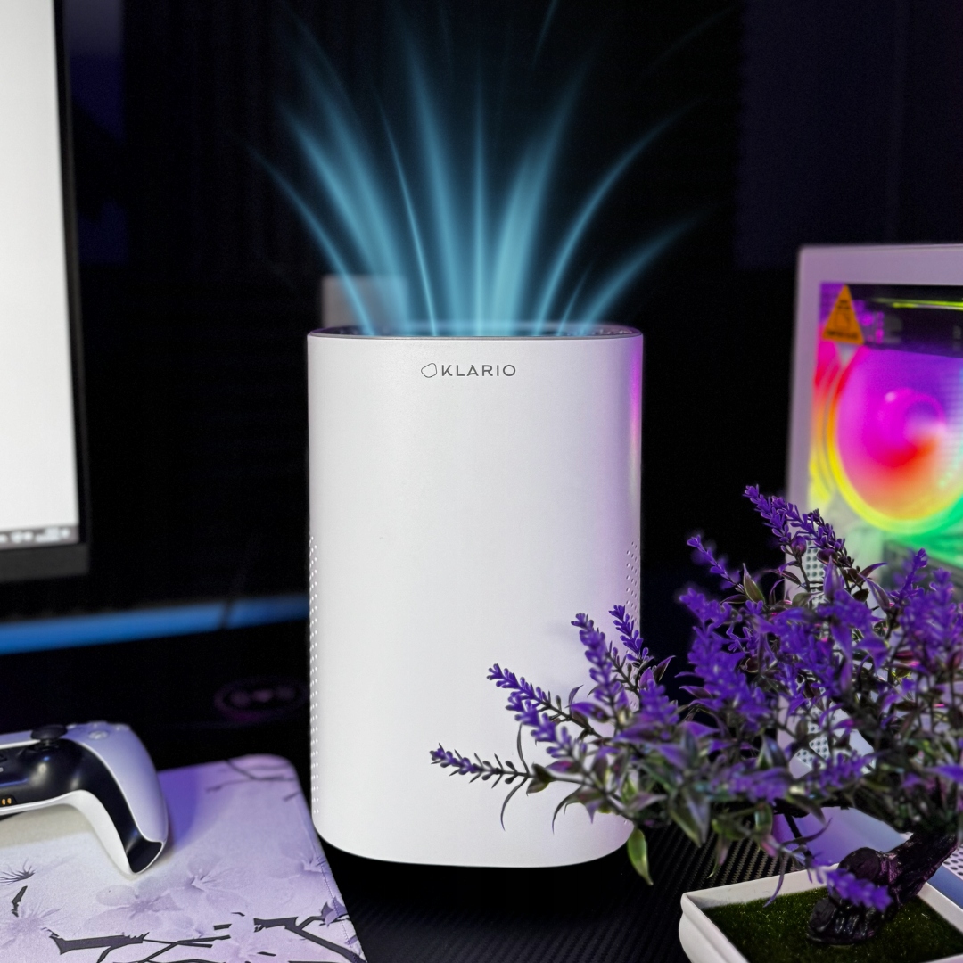 KLARIO також ідеально підходить для стільного або комп’ютерного столу. Під час роботи або навчання він ефективно видаляє пил, алергени та частки з електронних пристроїв, які накопичуються навколо монітора та клавіатури.