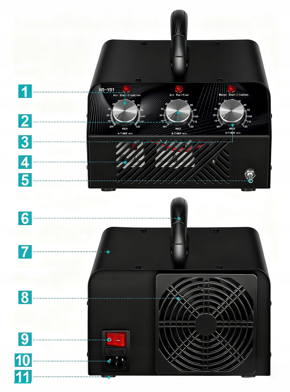- Режим «HOLD»: озонатор працює, доки його не вимкнуть вручну. Рекомендація: уникайте тривалої роботи, щоб подовжити термін служби машини.