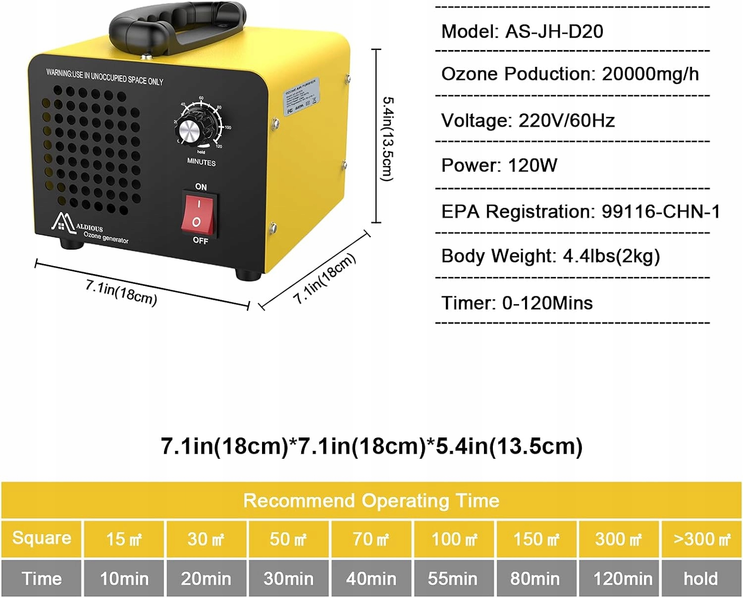- Ефективна дезодорація: озон видаляє та нейтралізує запахи, диму, їжі, домашніх тварин та інші загальні запахи. Це робить озонатор особливо корисним у нових будинках, кухнях, транспортних засобах, зоомагазинах, готелях, ресторанах і гаражах. Озонатор ALDIOUS має міжнародні сертифікати FCC і CE і безпечний у використанні.