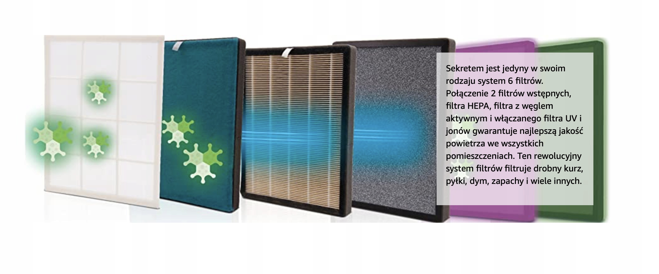 - Поєднання 2 попередні фільтри, фільтр HEPA, фільтр з активованим вугіллям і змінний УФ-фільтр та іонний фільтр гарантують найкращу якість повітря в усіх приміщеннях