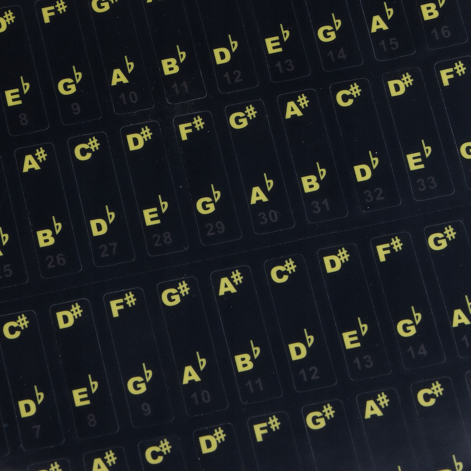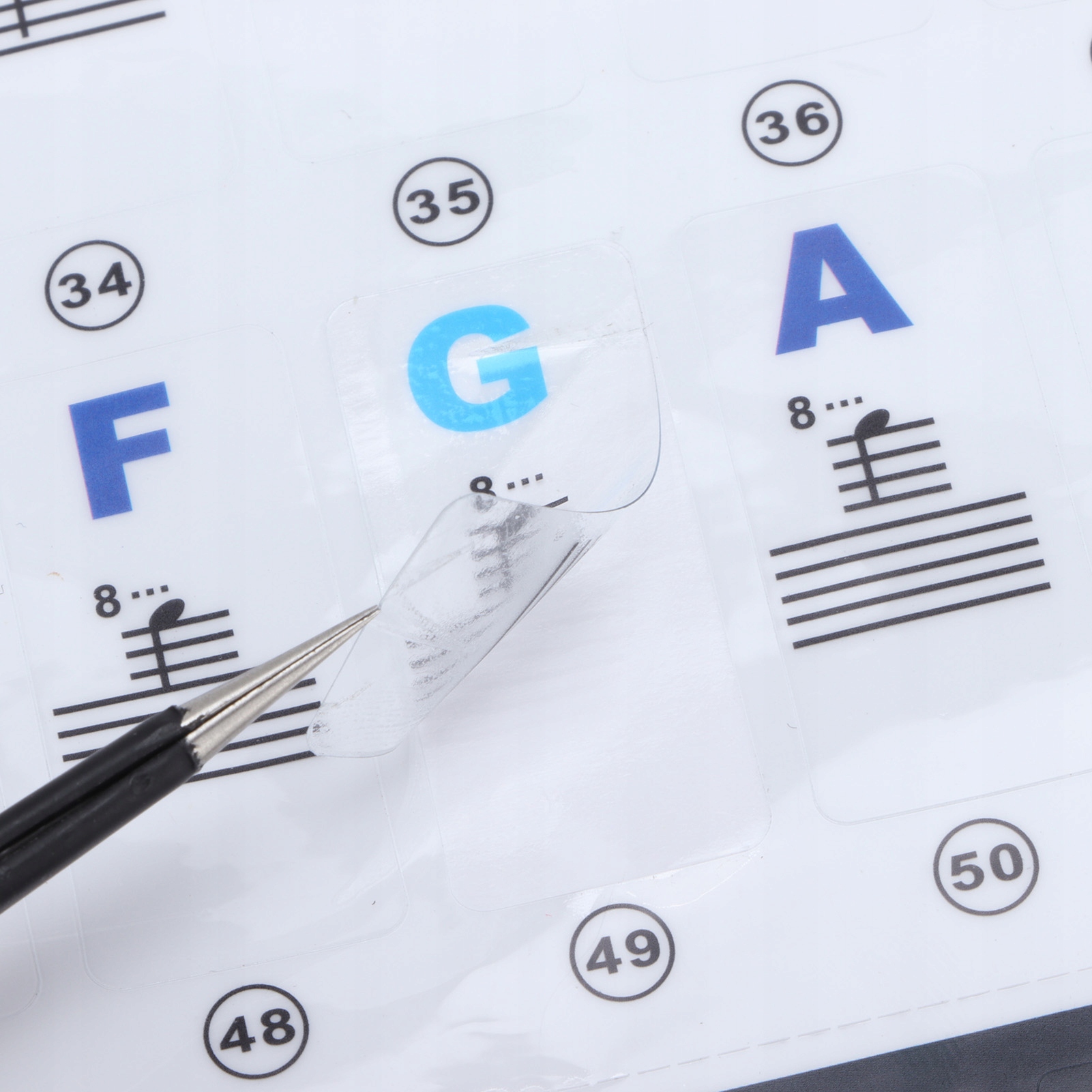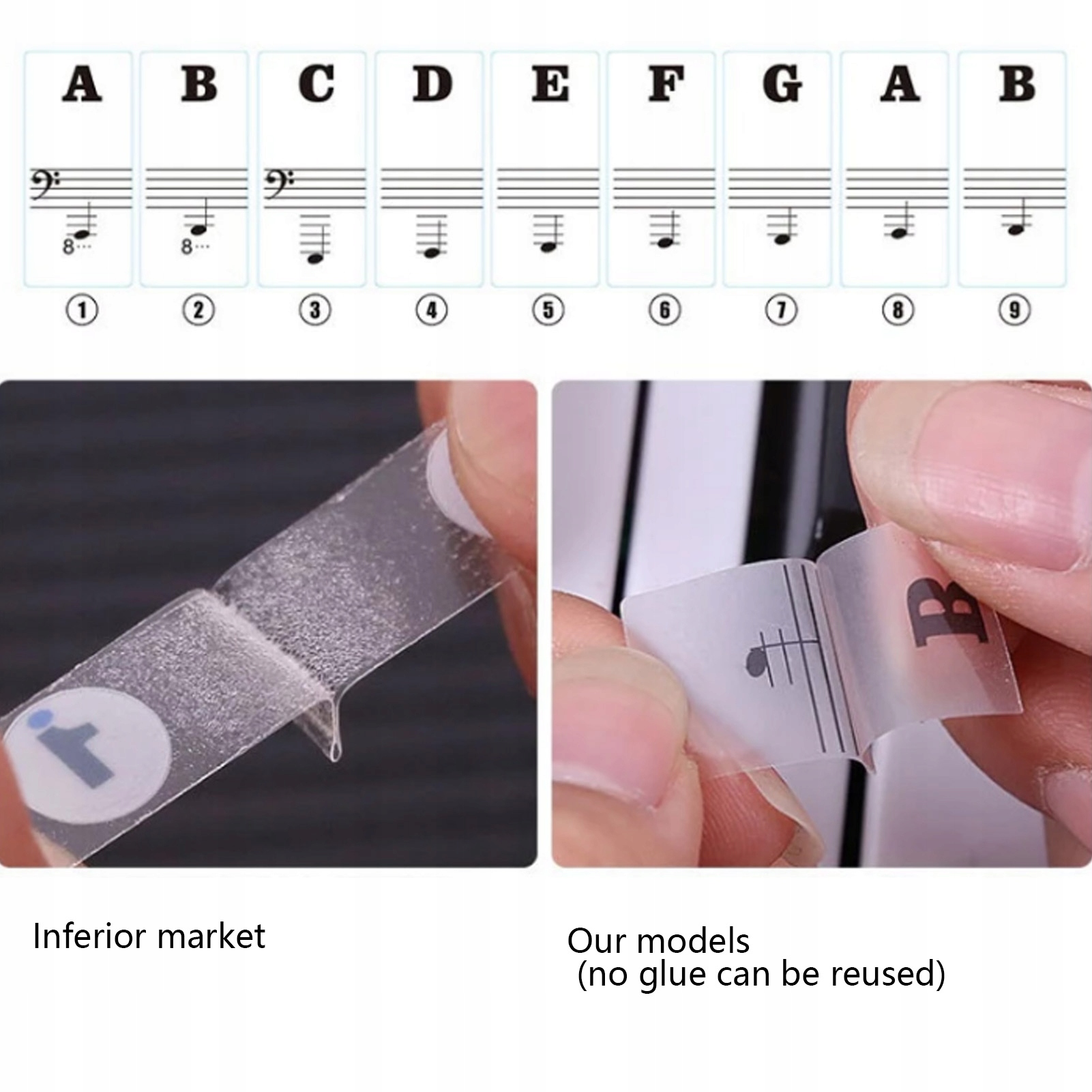 1. Виготовлений з високоякісного прозорого OPP, а клавіші прозорі і добре видно. 2. Виготовлений з екологічно чистих матеріалів і може використовуватися багаторазово, не затримує клей і не пошкоджує ключі. 3, можна використовувати для піаніно, електронних піаніно та ручних піаніно, універсальна наклейка для цього типу інструментів. 4, хороший навчальний інструмент для початківців, який допомагає студенту швидко запам'ятати клавіатуру. 5, наклейку піаніно легко наклеїти та видалити, вона зручна у використанні та роботі.