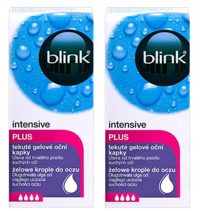 Зволожуючі очні краплі призначені для користувачів контактних лінз і всіх людей, які відчувають втому і сухість очей, наприклад, під час роботи за комп'ютером. Гелеві краплі Blink Intensive Plus захищають рогівку від висихання, залишаючи зволожуючий шар на поверхні ока.