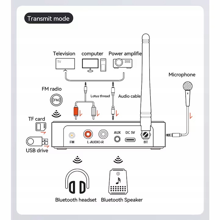 У режимі Rx можна відтворювати музику на старому динаміку/підсилювачі на планшеті мобільного телефону. Режим Tx підтримує настільний комп’ютер.