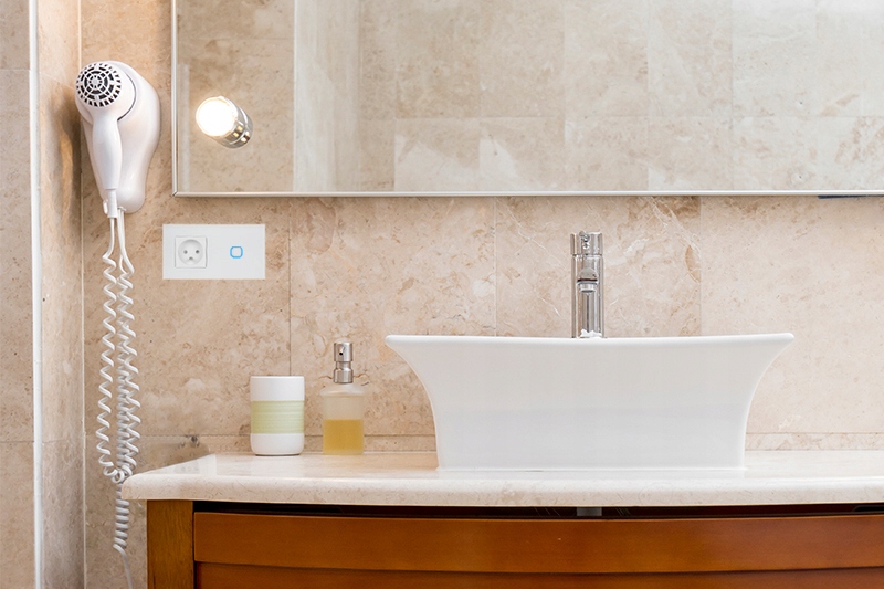 Завдяки технології WetHands панель з розеткою можна використовувати в кожній ванній кімнаті. Ви можете легко керувати нею мокрими пальцями. Встановіть вимикач із розеткою біля дзеркала та одним рухом руки ввімкніть освітлення біля дзеркала та підключіть для зарядки зубну щітку, бритву чи фен.