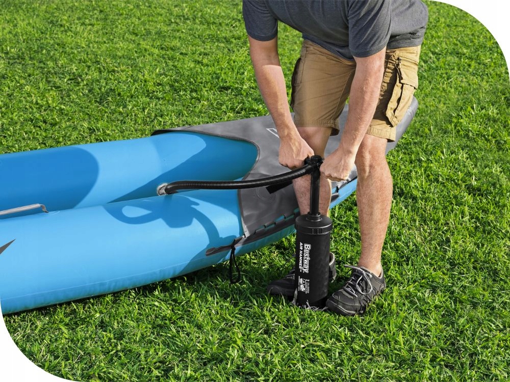 Набір містить два знімних ласта різних розмірів, які забезпечать орієнтовану підтримку в різних умовах води. Підлога в каяку надувна. Для комфорту використання оснащений надувними сидіннями зі спинкою. Транспортувати каяк не складе труднощів - він оснащений ручками і до того ж легкий. Має бостонський клапан, який дозволяє швидко накачувати та спускати повітря з байдарки. Оснащений веслами і поршневим насосом. Крім того, набір містить ремонтну латку, за допомогою якої можна виправити будь-які незначні пошкодження.