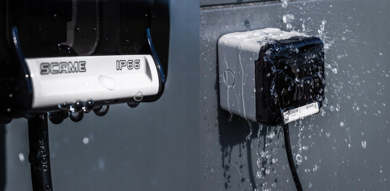 гніздо з серії Protect має унікальну та відмінну перевагу герметичної переваги - підтримка ступеня захисту IP66, навіть якщо вилниця підключена до розетки. Можна завдяки використанню гель -прокладки, встановленої на панелі кришки та корпусу розетки. Обидва елементи гелевої прокладки з'єднуються один до одного, коли корпус розетки закривається та кришку, підтримуючи їх гнучкість і, таким чином, "адаптується" до форми кабелю і герметизуючи його. Це дозволяє використовувати підключені пристрої навіть під час контакту зі стисненим потоком води, наприклад При миттях стінок з шайбою тиском.