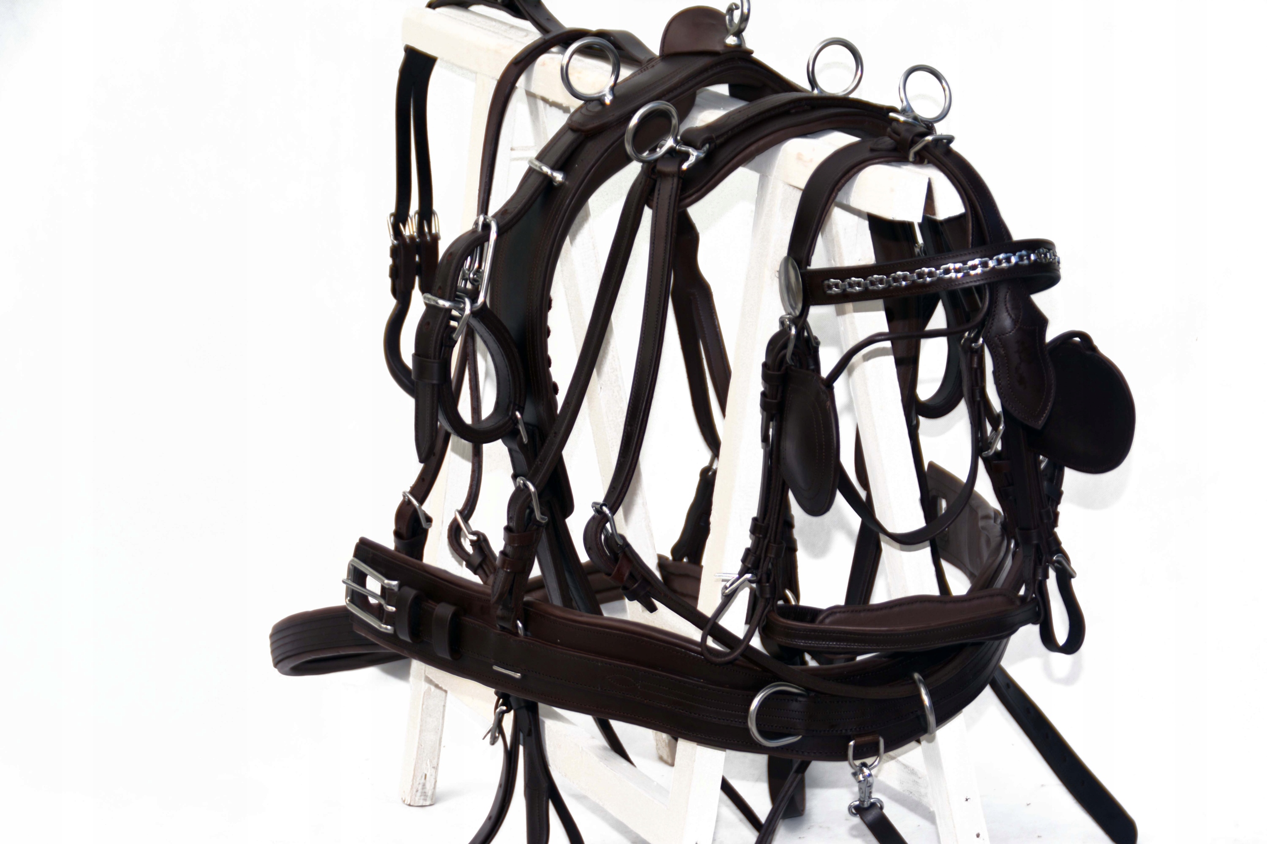 ОДИНАРНИЙ КОРИЧНЕВИЙ РОЗМЕР. повний Упряж виготовлено повністю з дуже якісної, добірної суцільнозернистої шкіри, дуже м’якої та приємної на дотик, профільована анатомічна грудна клітка, профільована пов’язка на голові, перенісся та потилична частина з м’якою підкладкою, оснащена нагрудником та анатомічно профільованим обхватом, вшита стрічка всі елементи збруї, яка призначена для зміцнення шкіри. Фурнітура з нержавіючої сталі.