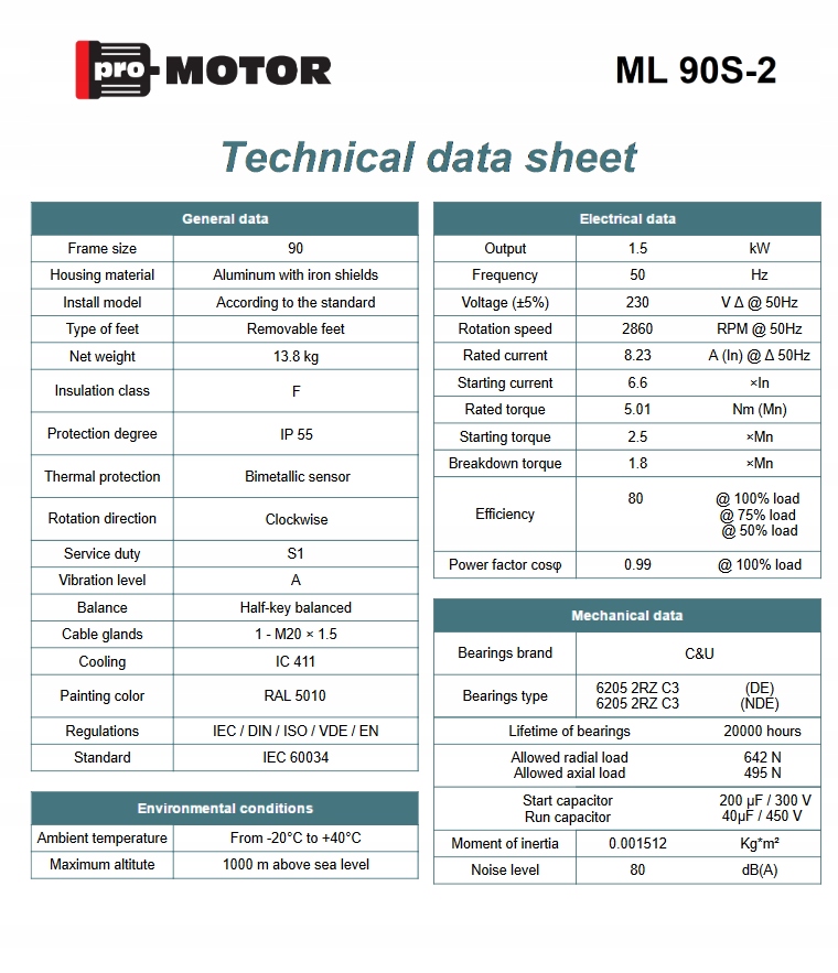Однофазний електродвигун Promotor ML 1.5кВт 2800 об/хв. 90 B5