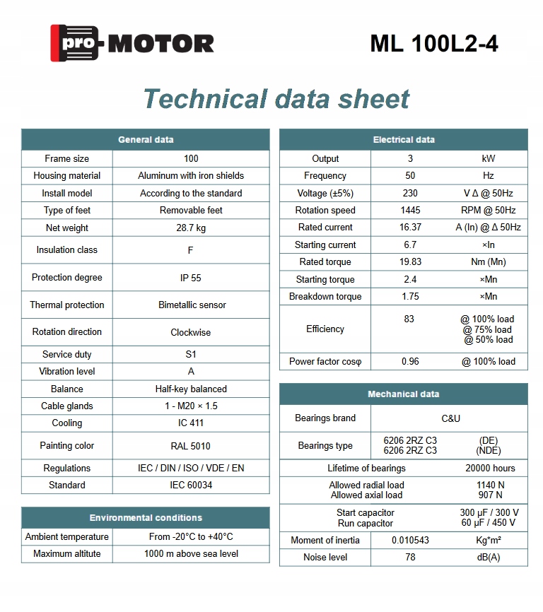 Однофазний електродвигун Promotor ML 3.0кВт 3кВт 1400 об/хв. 100 B3