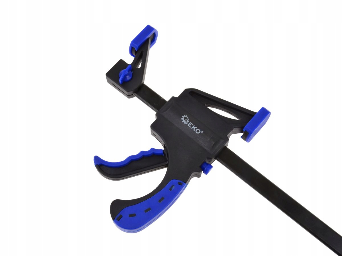 Високоякісний одноручний столярний затискач від відомого бренду GEKO. Система швидкого ковзання дозволяє керувати затискачем однією рукою. Він має можливість переміщати верхню щелепу та використовувати затискач як розширювач.
