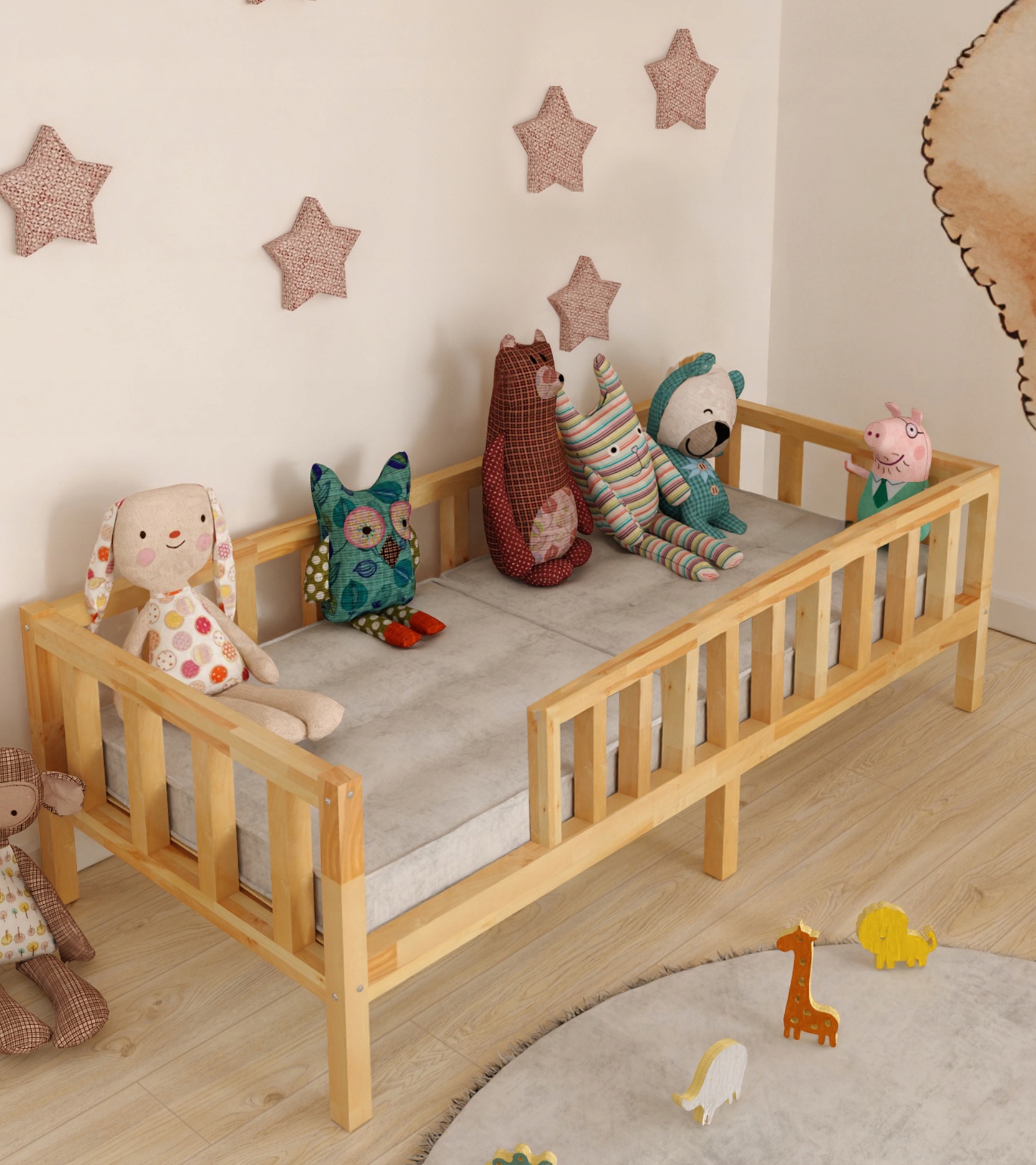 - Solid pine wood construction with protective barriers