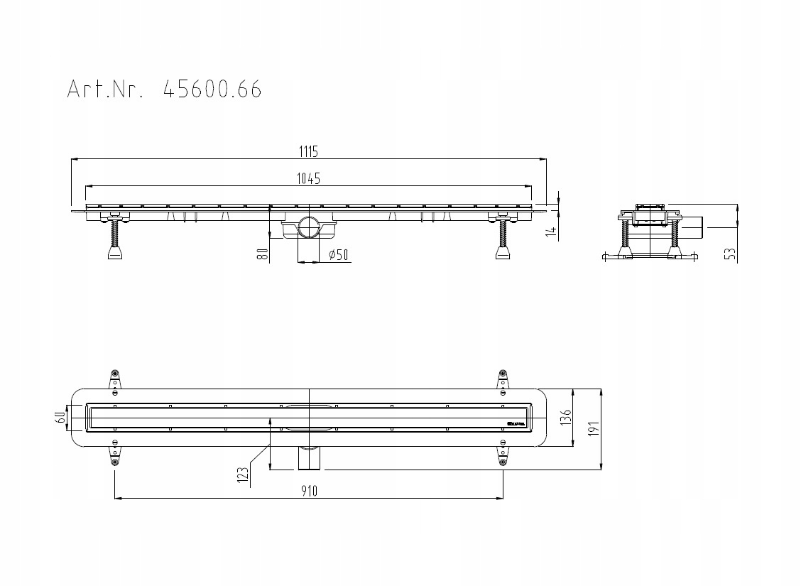 - збоку злив DN50, L=1050