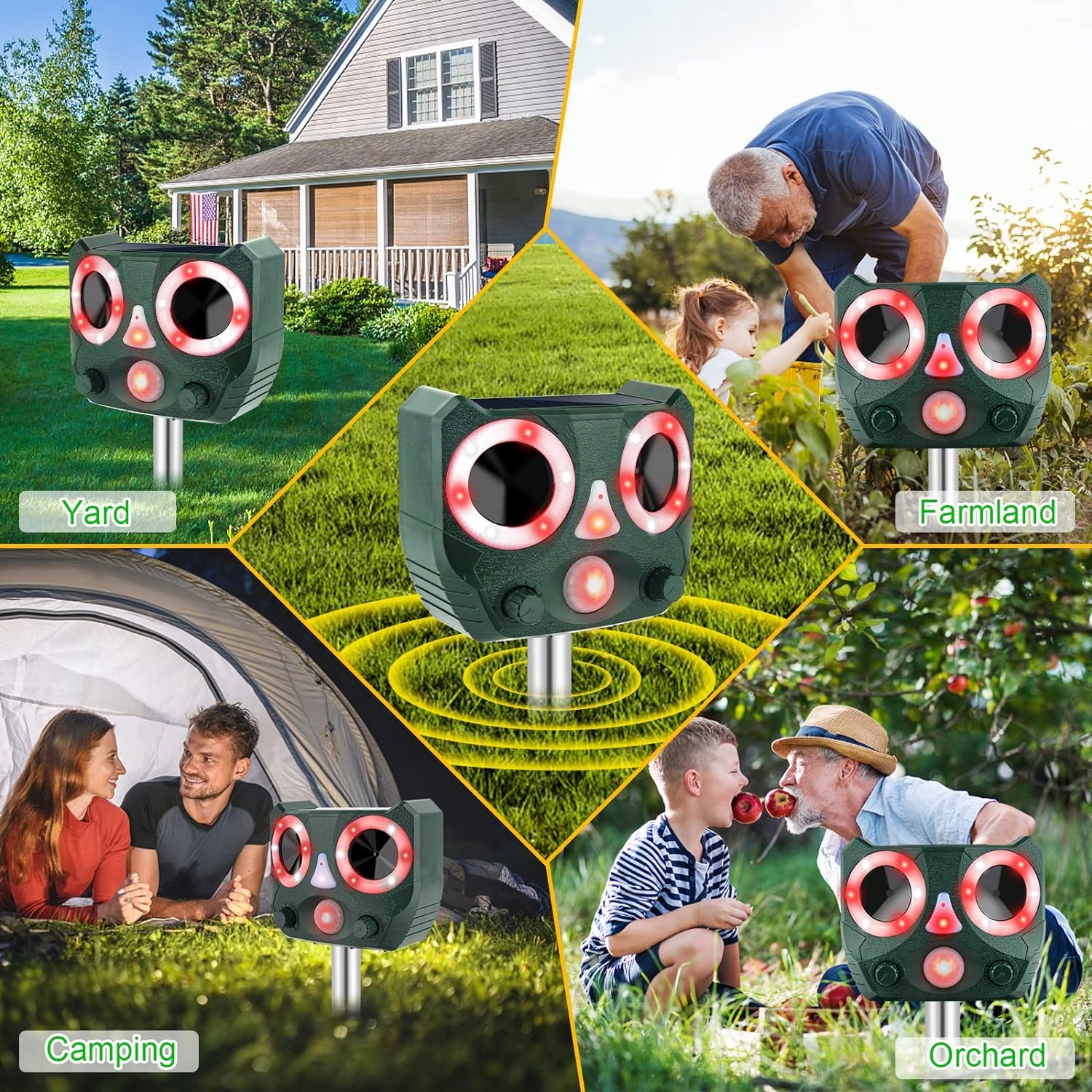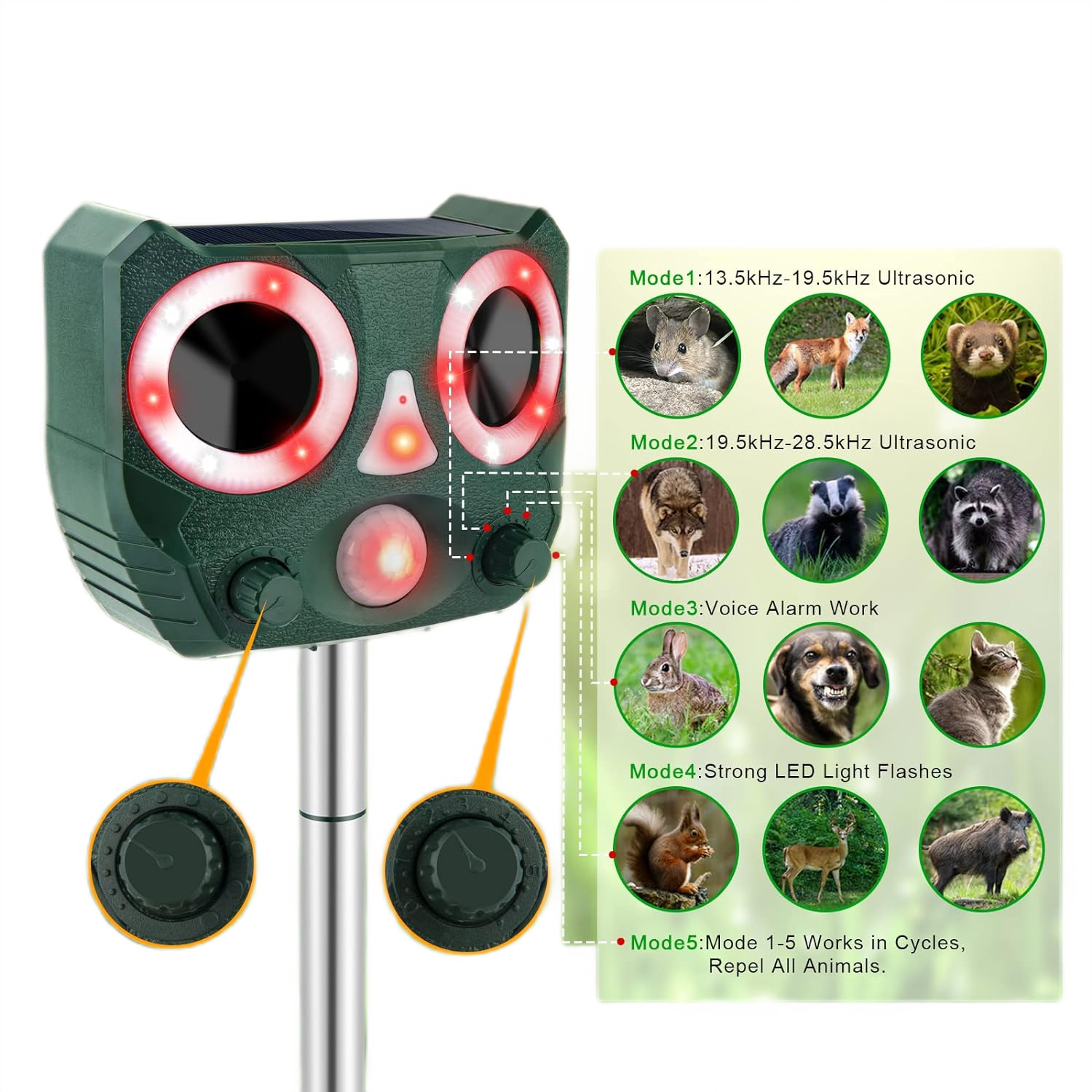 Сильні ультразвукові сигнали, блимання світло та звуки, які лякають птахів, собак, котів, білок, мишей, лисиць, тхорів, єнотів, борсуків, скунсів, єнотів, кабанів, цвіркунів тощо далеко від дому у вашому дворі чи саду.