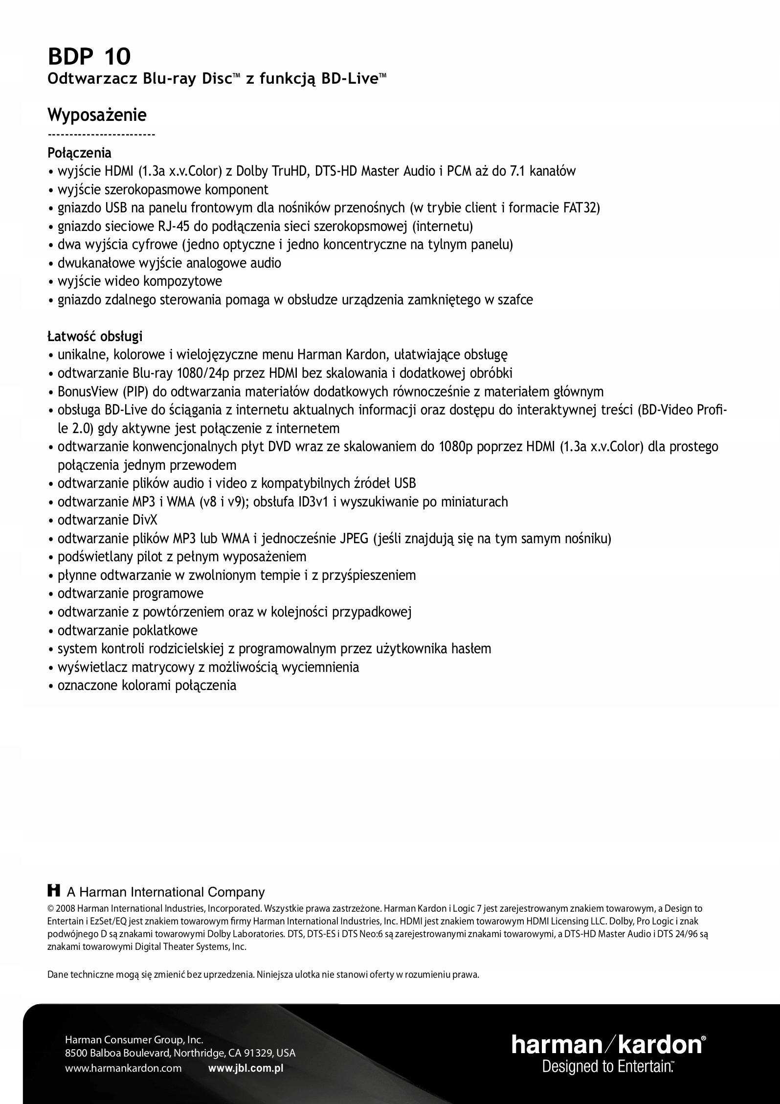 Просматривая «Odtwarzacz Blu-ray Harman Kardon H/K BDP10», вы можете быть уверены, что данный товар из каталога «[rubrica_name]» будет доставлен из Польши и проверен на целостность. В цене товара, указанной на сайте, учтена доставка из Польши. Внимание!!! Товары для Евросоюза, согласно законодательству стран Евросоюза, могут отличаться упаковкой или наполнением.