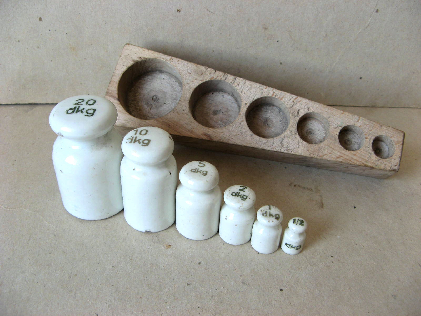 Odważniki PORCELANOWE w Drewniane ETUI do STARA WAGA : KOMPLET