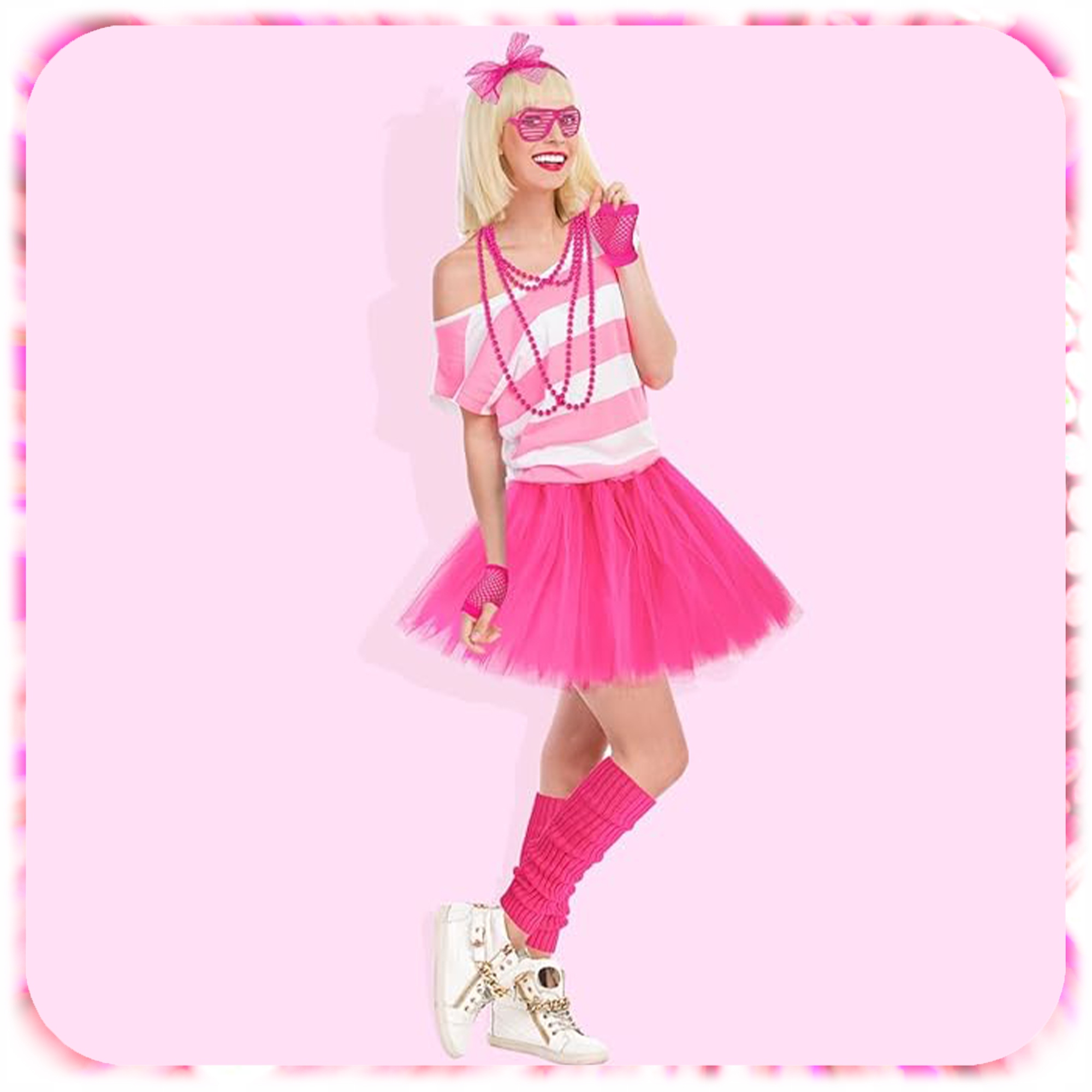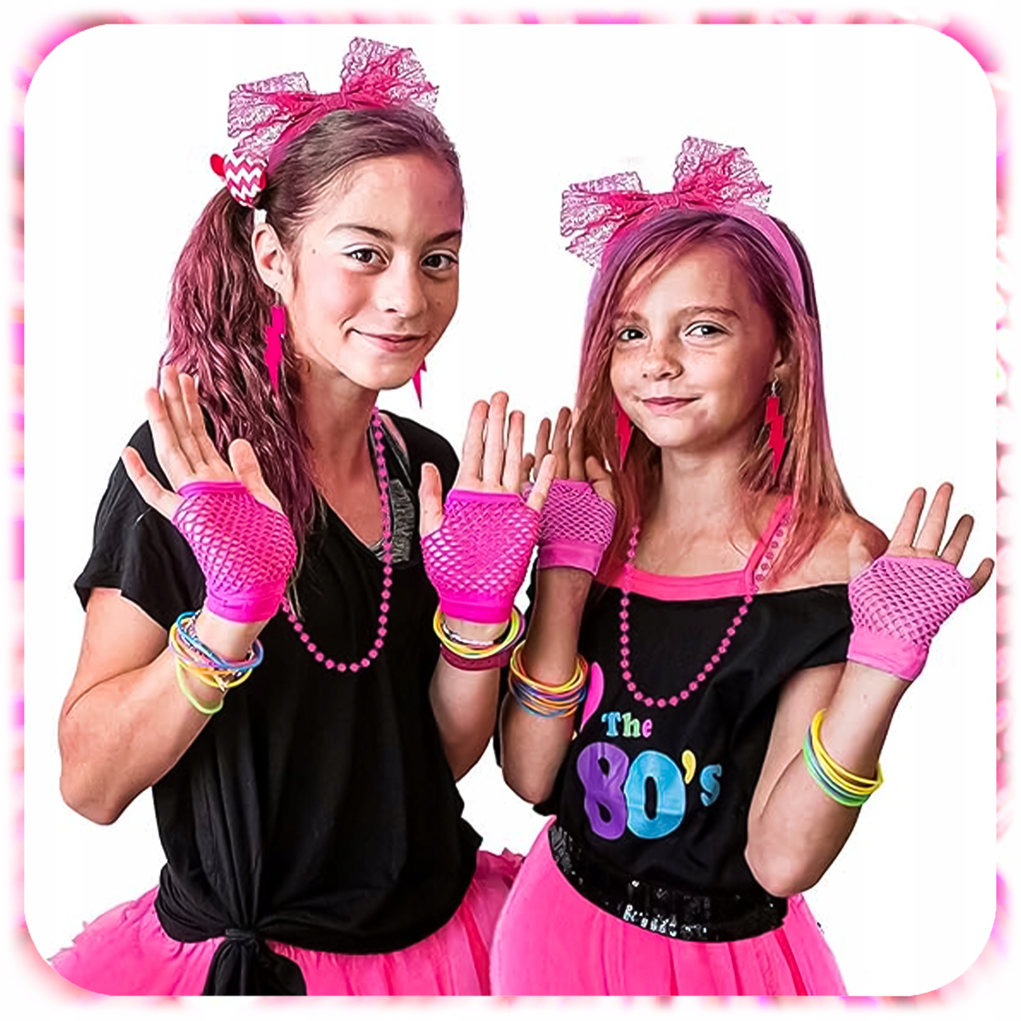 Ретро-неоновий набір 8 в 1, натхненний 80-ми! Спідниця, пов'язка, окуляри, рукавички, браслети, намиста та багато іншого. Ідеально підходить для Хелловіна, карнавалу та дискотеки - сповнений кольорів, енергії та стилю!