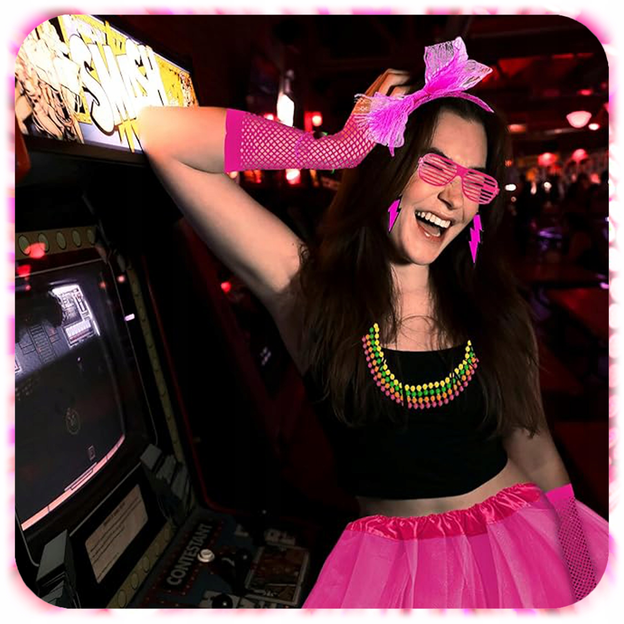 Це комплект, який сяє в ритмі диско та поп-музики! Неонові кольори, характерні аксесуари та спідниця з фатину створюють автентичну атмосферу вечірок 80-х. Кожен елемент розроблено, щоб привернути увагу та додати енергії будь-якому образу – від карнавалу до концерту.