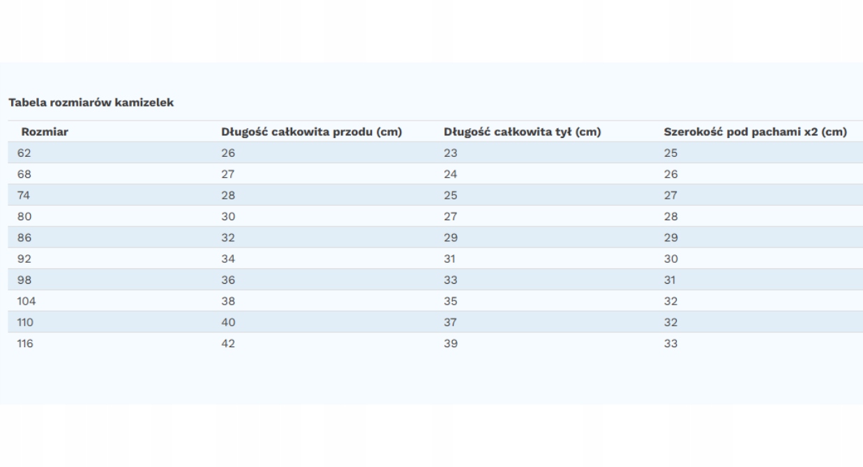Вік Розмір Довжина тіла (см) Довжина рукава (см) Окружність тіла (см) 1М 56 31 20 47 3M 62 33 21 49 6M 68 37 22 51 9М 74 40 24 55 12M 80 42 27 57 18M 86 43 30 59 24M 92 45 32 60