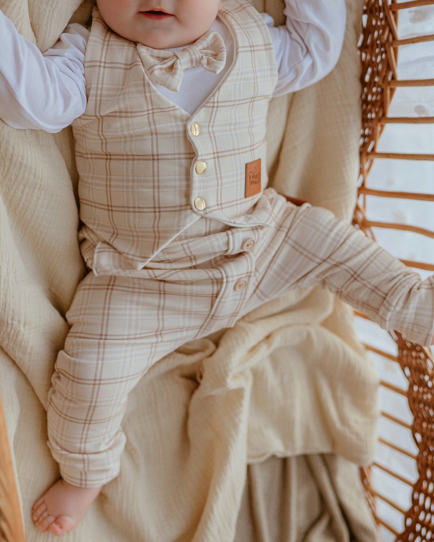Набір Olek Kratka створено для поєднання елегантності з комфортом. Виготовлені в нашій майстерні з м'яких дихаючих матеріалів, безпечних для чутливої дитячої шкіри. Класичний картатий жилет додає шику, штани з еластичним поясом гарантують свободу, а боді робить весь образ бездоганним протягом багатьох годин - без будь-яких виправлень.