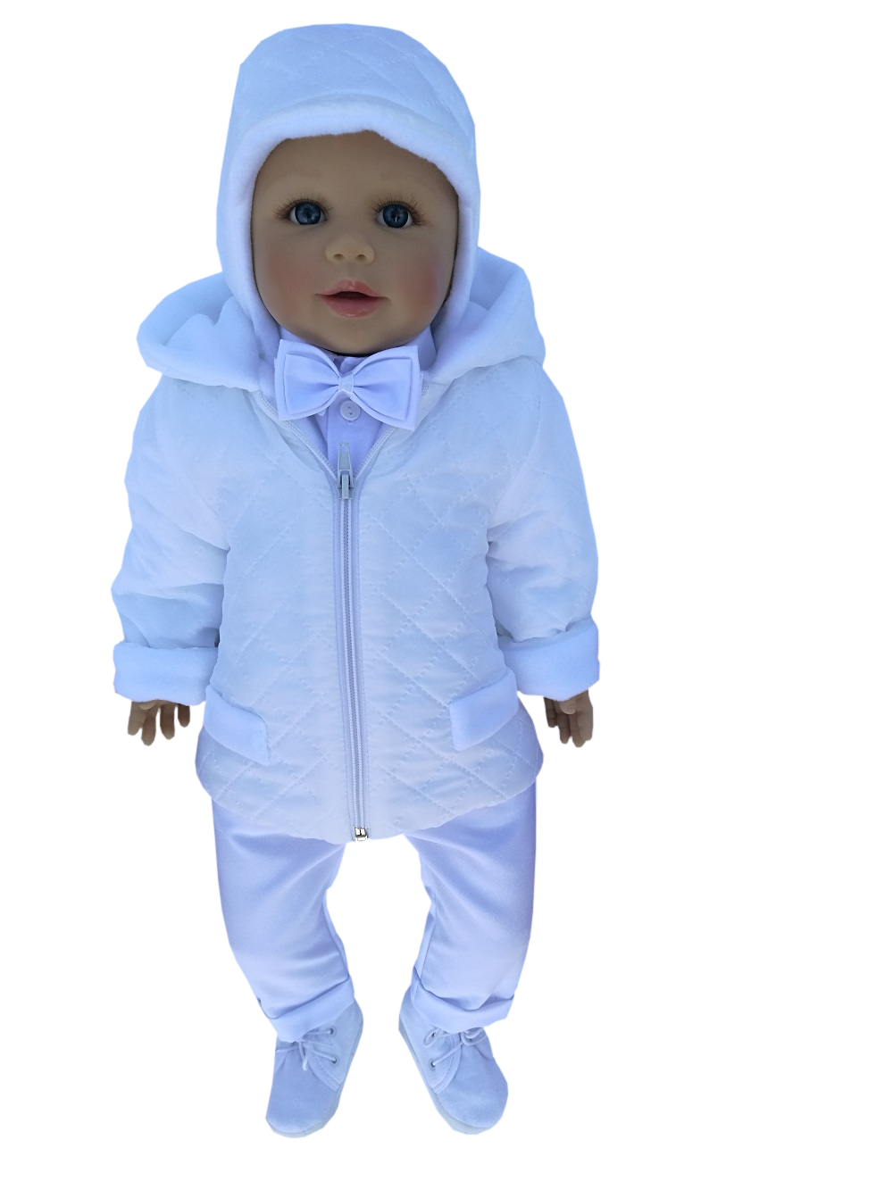 БІЛІ ШТАНИ - З КОСТЮМНОЇ ТКАНИНИ, ПРАСАТОВАНІ ДО КРАЮ, ЗРУЧНІ Гумка на талії. БІЛА ШАПКА-КАЛЬКА - ЗАКРИВАЄ ВУХА ДИТИНИ, ПРАКТИЧНА ЗАВДЯКИ ШНУРКУ З СЕКУНДОМІРОМ. ЗРОБЛЕНА ЗІ стьобаної тканини, УТЕПЛЕНА МИЛИМ ФЛІСОМ. СТАВКУ КАПЕЛЮХА МОЖНА ЗБІЛЬШИТИ АБО ЗНИЖИТИ, ОБИДВА ВЕРСІЇ ВИГЛЯДАЮТЬ МИЛО.БАТІК -БІЛИЙ ДОВГИЙ РУКАВ З ГУДЗИКАМИ.ЖГУТ БІЛИЙ -ГУДЗИК З ГУДЗИКАМИ. ЗАКРИВАННЯ БУЛО ЗІ СПРАВЖНЬОЇ ШКІРИ. ДЯКУЮЧИ РЕГУЛЮВАННЮ МОЖНА РЕГУЛЮВАТИ ДОВЖИНУ РЕПЛЯЖІВ.КУРТКА З КАПЮШОНОМ - ВИШИТАНА З СТИЛАННЯ, ДОДАТКОВО ОБШИТАНА ТЕПЛИМ ФЛІСОМ (ГУЩ. ФЛІСУ АДАПТУЄТЬСЯ ДО СЕЗОНУВЕСНА/ОСІНЬ - ТОНКИЙ ФЛІС, А ВЗИМКУ - ЩІЛЬНИЙ ФЛІС). КУРТКА НА БЛИСКАВЦІ, РУКАВИ РЕГУЛЮЮТЬСЯ.БІЛИЙ МЕТЕЛИК ЗІ СТРІЧКОЮ.МОДЕЛІ: № 3