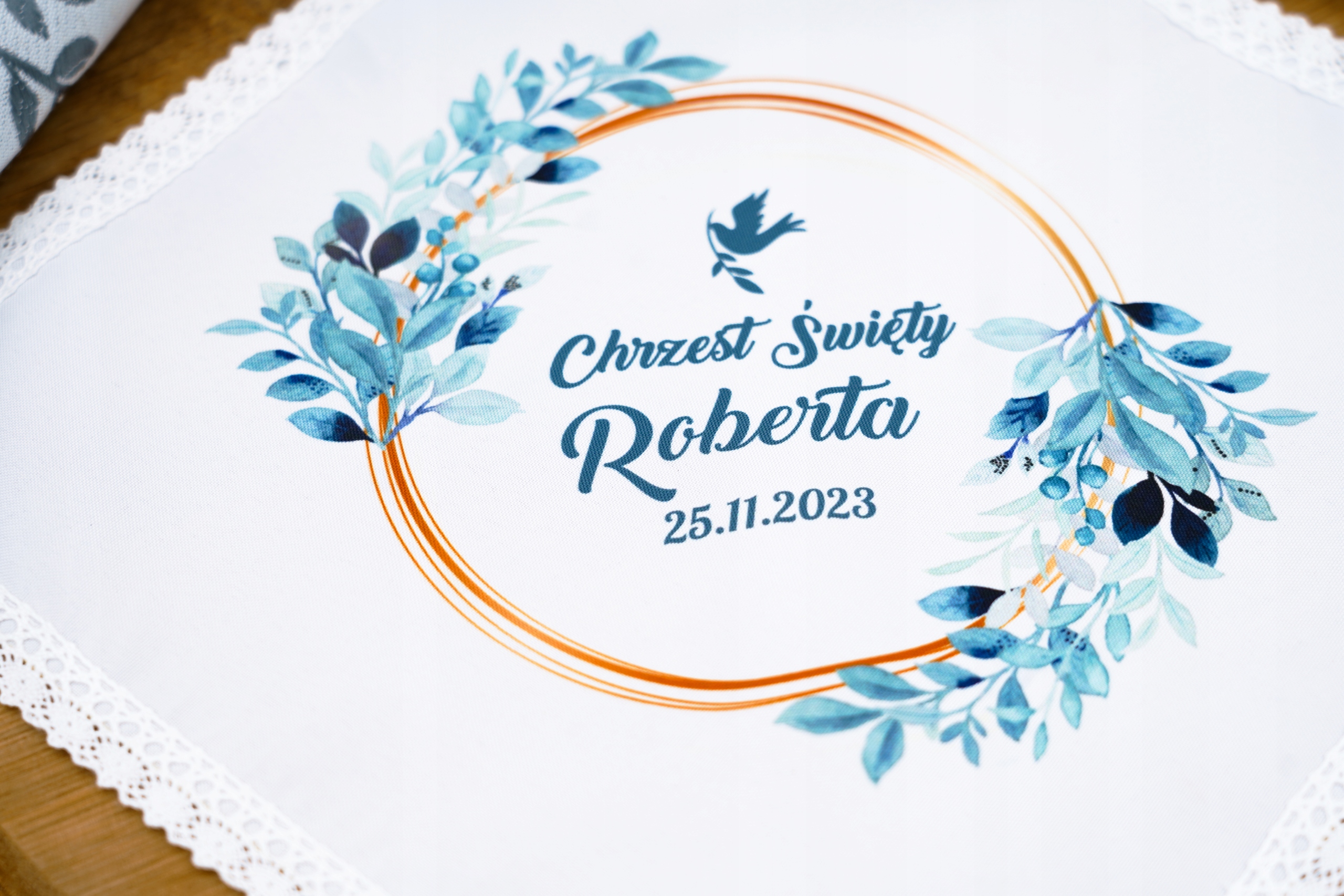 - хрестильне вбрання з кольоровим принтом разом з ім'ям дитини та датою хрещення >